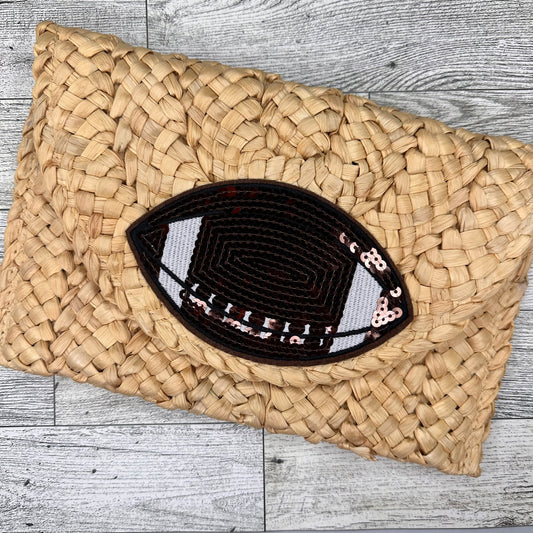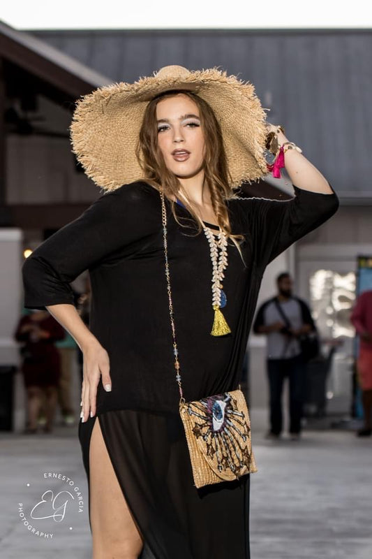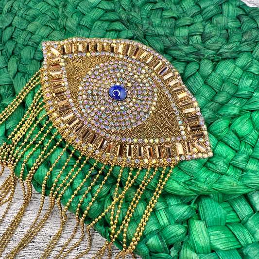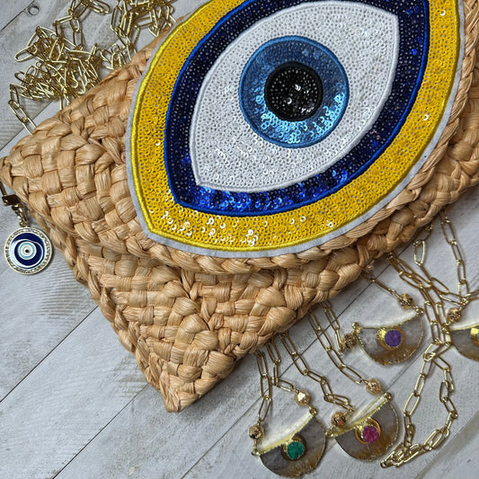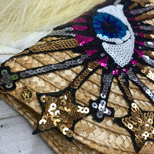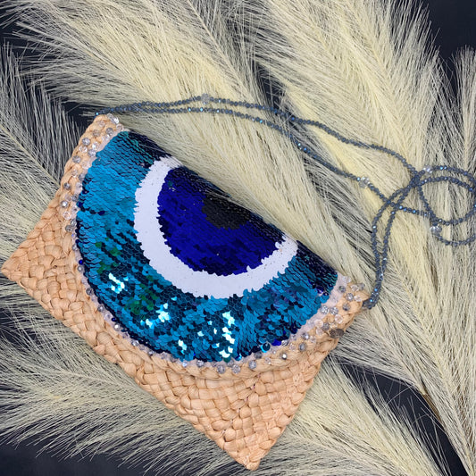 Evil Eye Straw Clutch made out of sequins and hand embellished with crystals 510-03 | Erika Williner Designs