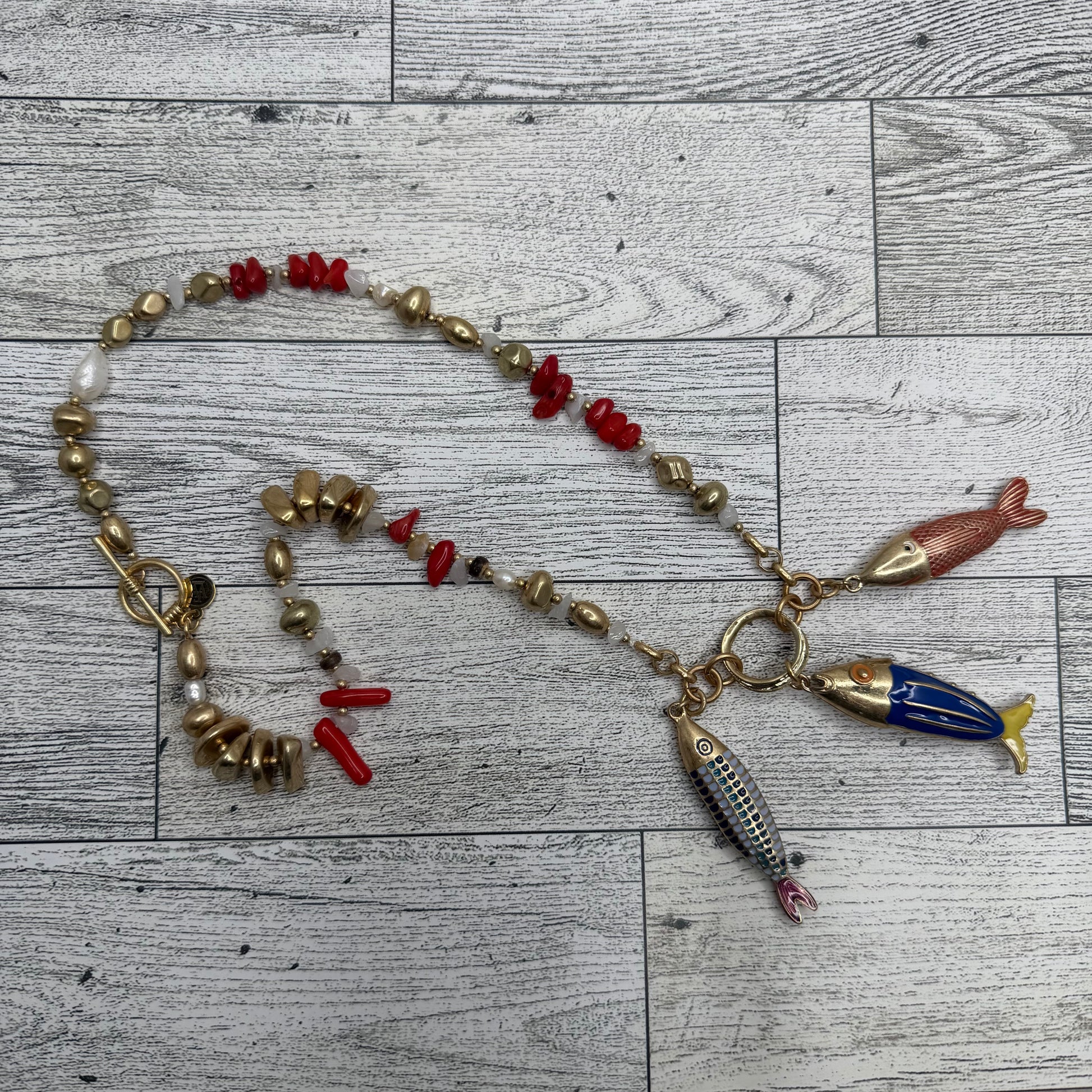 Dive into whimsy with this charming three-fish necklace, where vibrant enamel pendants swim alongside lustrous freshwater pearls and warm gold acrylic beads. Each piece celebrates ocean-inspired artistry with a delicate coral accent that brings coastal elegance to your everyday style. Perfect for those who appreciate handcrafted jewelry with personality and meaningful design details.
