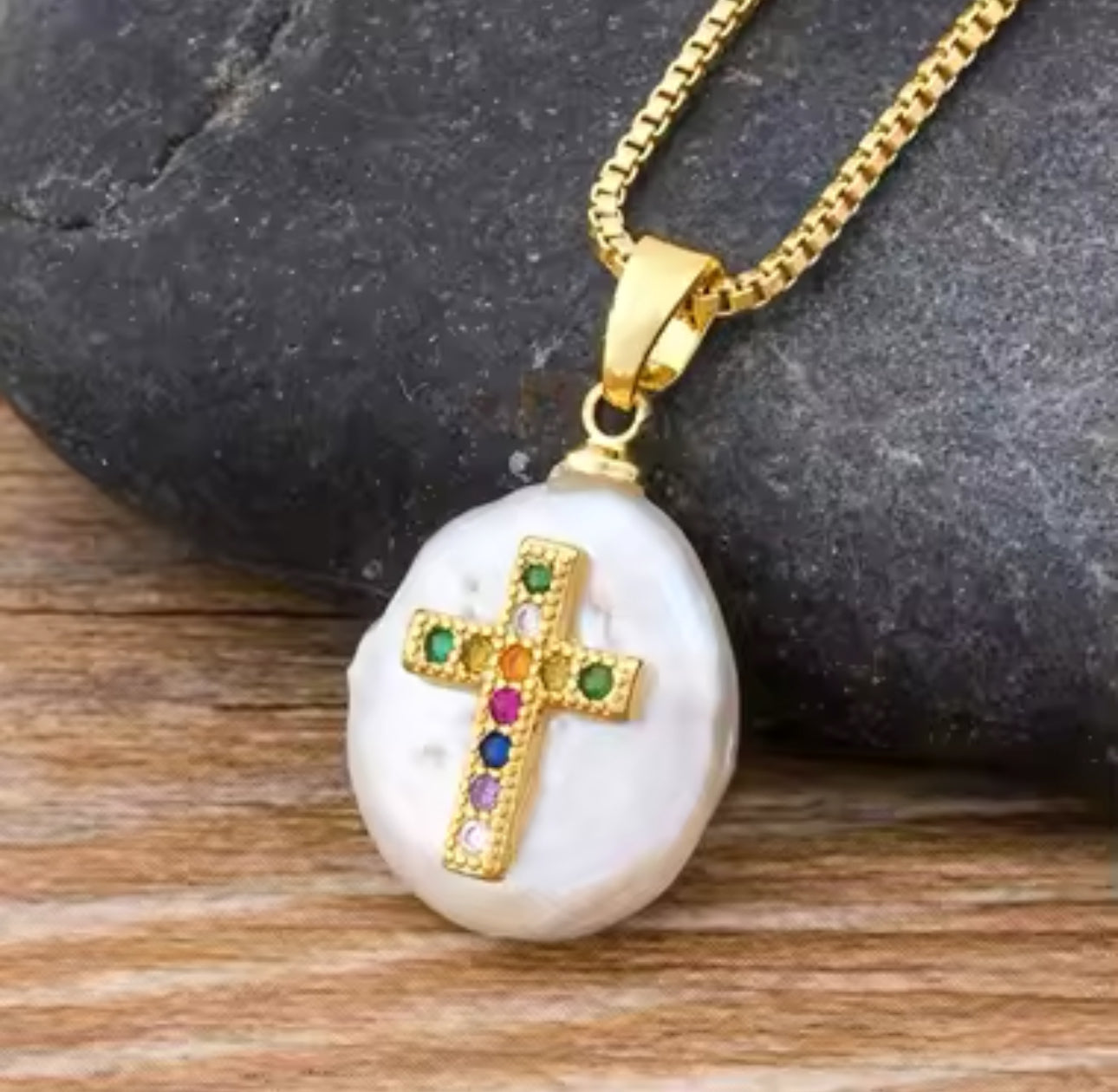 Coin Pearl Pendant with Multicolor Cross Necklace | Erika Williner Designs