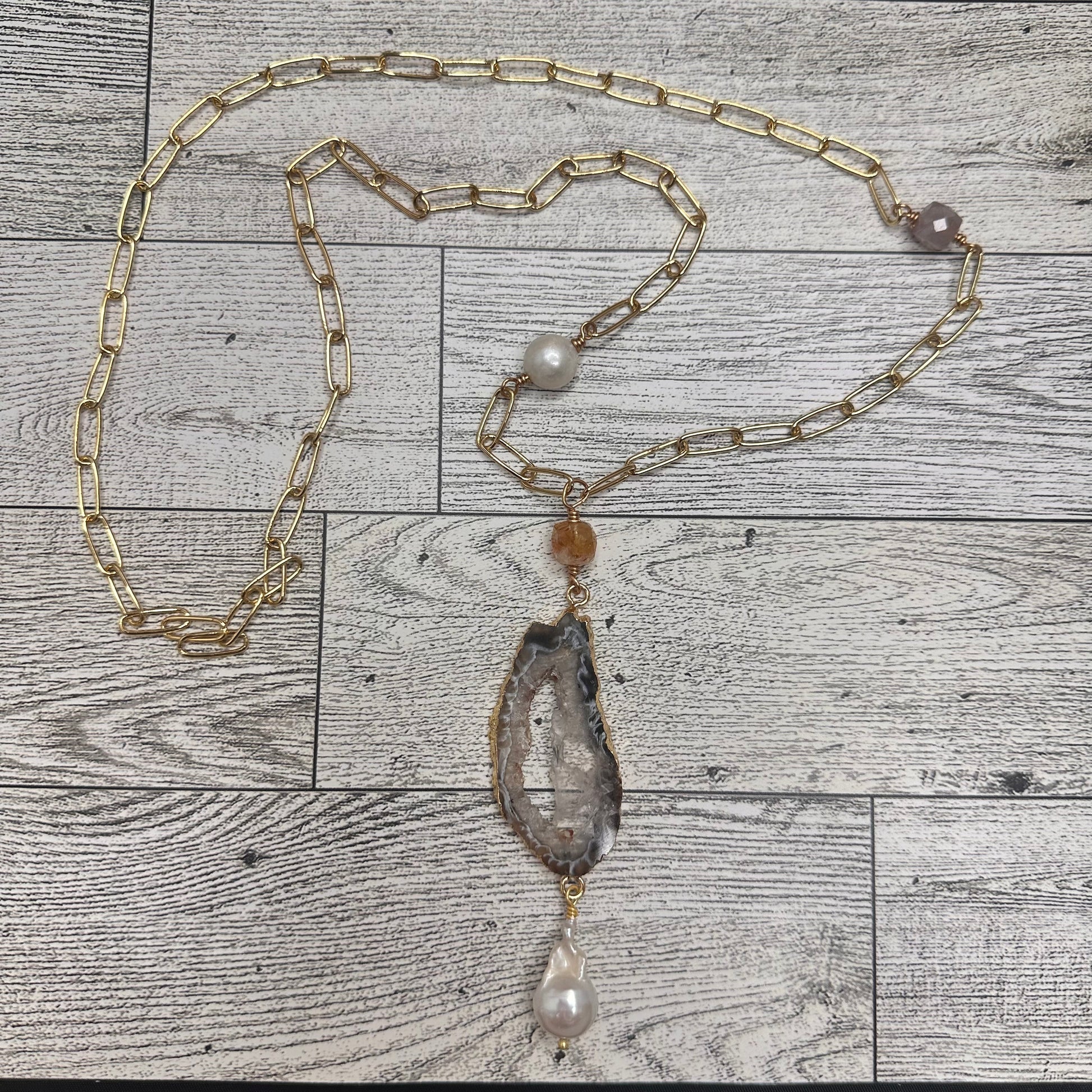 Elevate your everyday elegance with this stunning paper clip chain necklace, a masterpiece that seamlessly blends natural beauty with contemporary design. Featuring lustrous baroque pearls and freshwater pearls paired with radiant citrines and shimmering agate druzy, each element has been thoughtfully selected to create a piece that catches the light from every angle. The modern paper clip chain design offers a fresh take on classic jewelry, making it versatile enough for casual wear yet sophisticated enough for special occasions. Whether you're layering it with other pieces or wearing it solo, this necklace becomes an instant conversation starter. Perfect for those who appreciate handcrafted jewelry that celebrates the unique character of natural gemstones, this is a timeless addition to any collection.