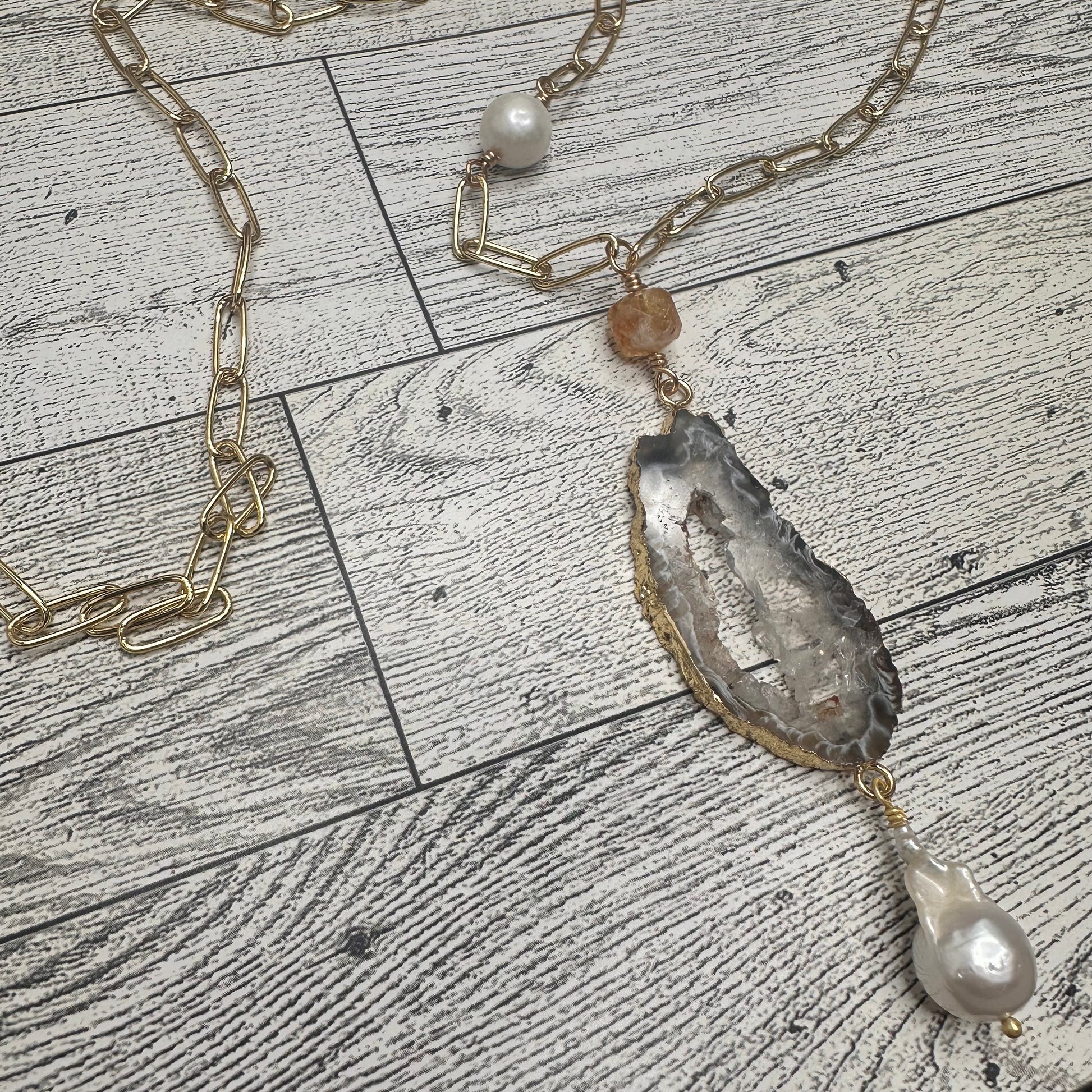 Agate Druzy, Baroque Pearl, Citrines and Fresh water Pearls Paper Clip Chain Necklace | Erika Williner Designs