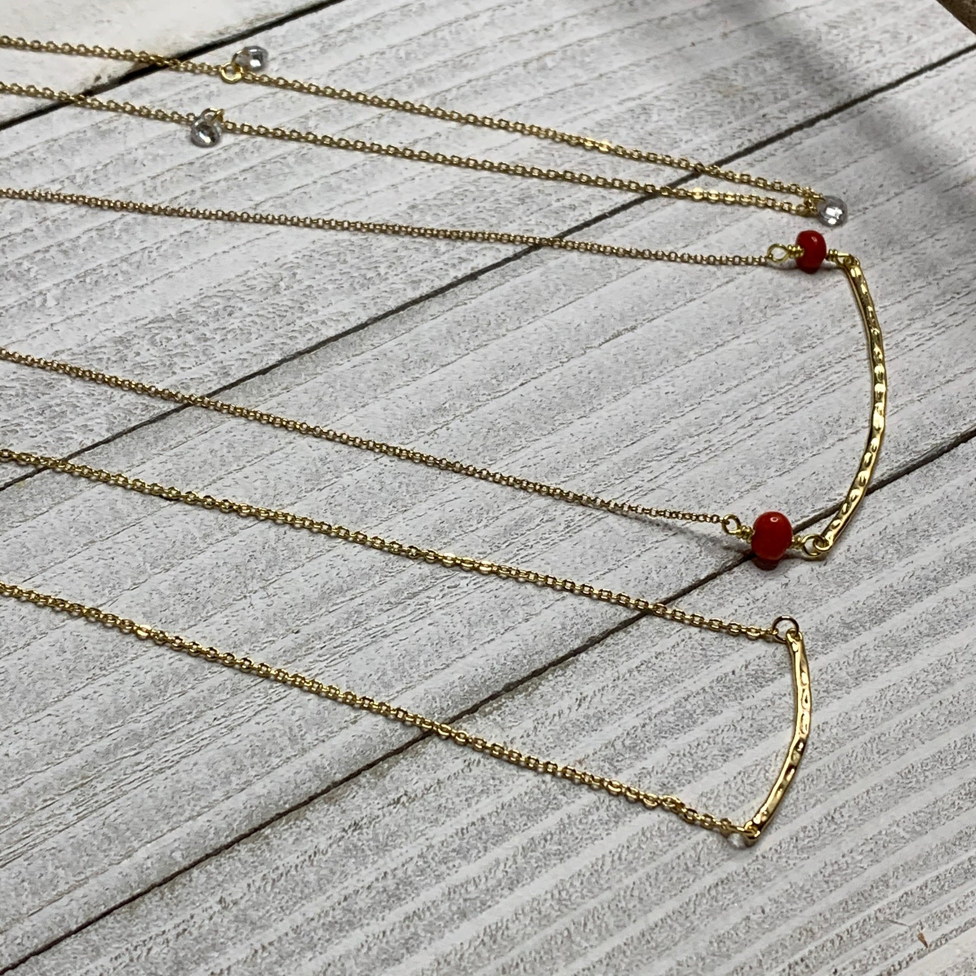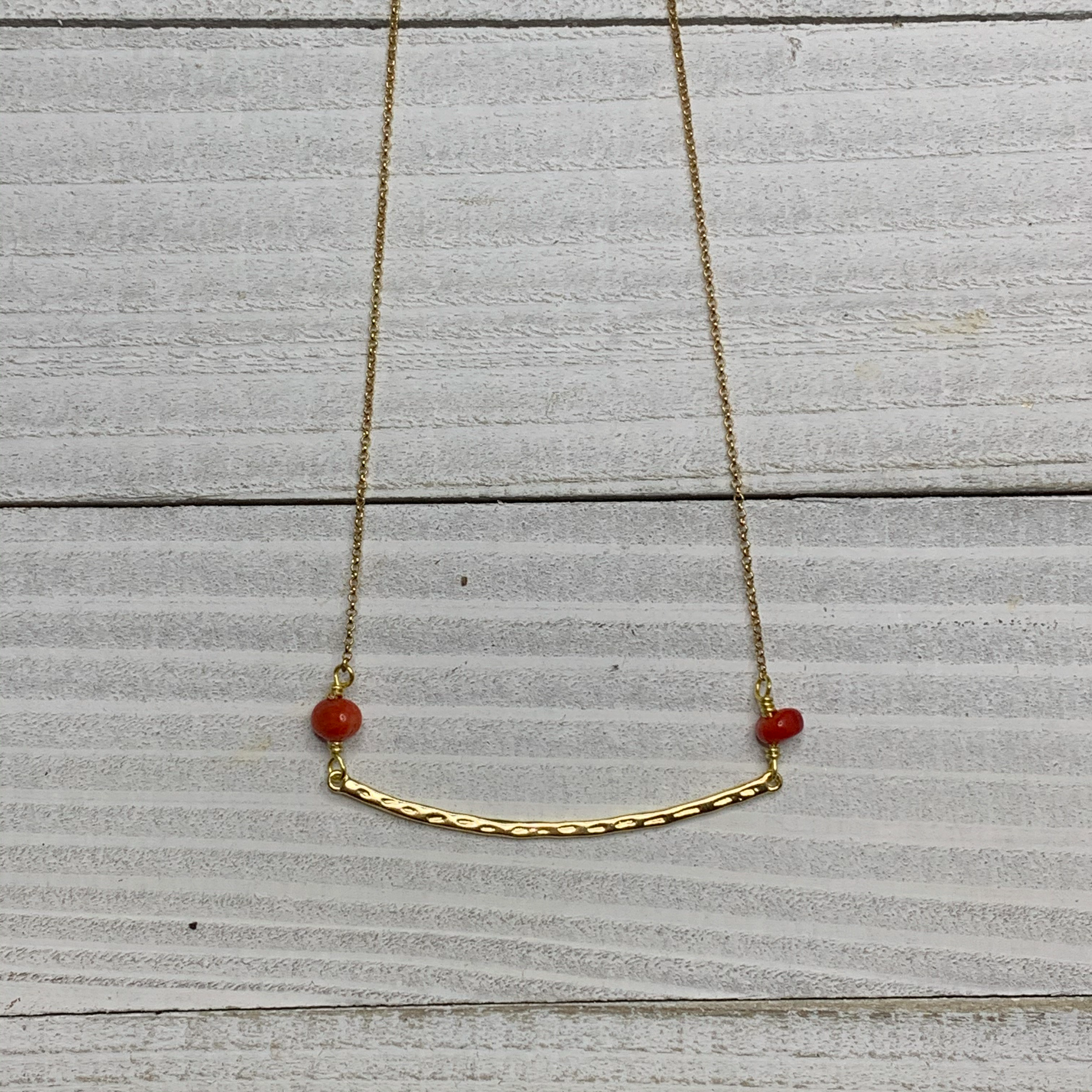 This Erika Williner Designs dainty 18k gold plated chain and hammered bar has red coral beads enhancing it.