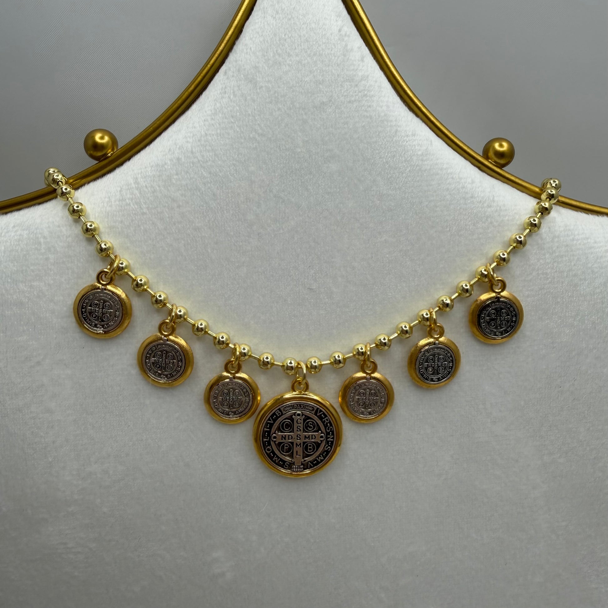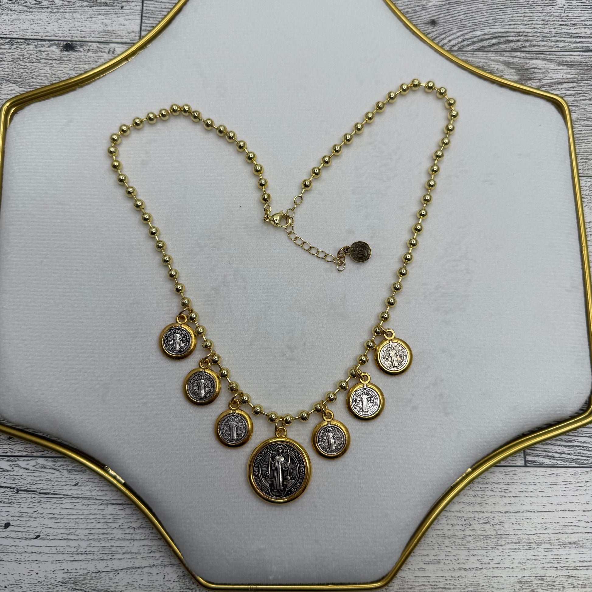 Elevate your everyday style with this refined San Benito medallion necklace, featuring a striking ball and chain design. The iconic medallion serves as a meaningful centerpiece, blending spiritual significance with contemporary elegance. Crafted with attention to detail, this piece transitions seamlessly from casual wear to special occasions, making it a versatile addition to any jewelry collection. A sophisticated statement that honors tradition while embracing modern aesthetics.