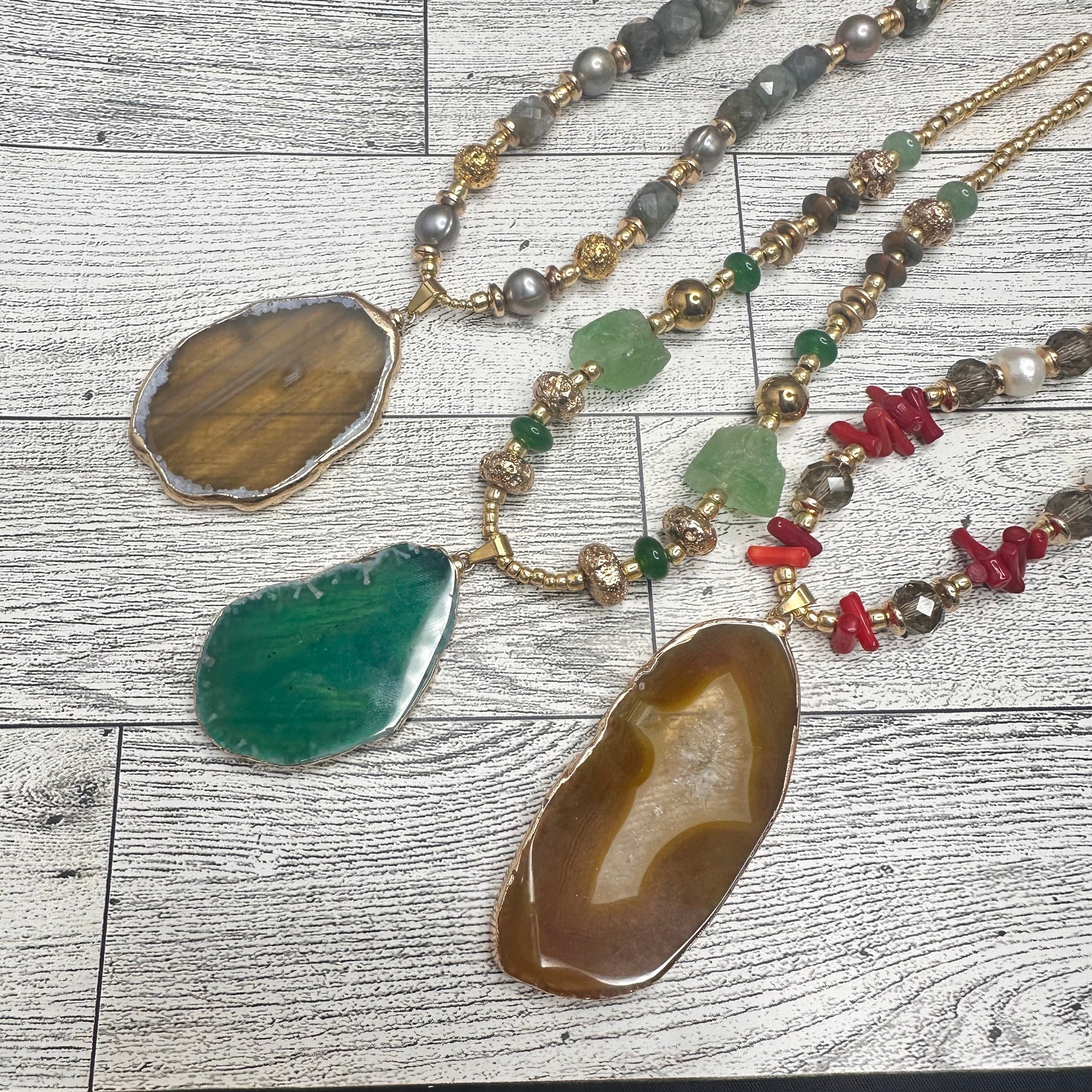 This exquisite pendant showcases the natural beauty of brown agate as its stunning centerpiece, complemented by an artfully curated collection of gemstones and materials. Smoky faceted crystals add depth and sophistication, while vibrant red coral branches bring organic movement and warmth to the design. Faceted citrines sparkle with golden light, fresh water pearls introduce lustrous elegance, and lava rock grounds the piece with earthy texture. Delicate golden glass seed beads tie everything together, creating a harmonious blend of natural and refined elements. This one-of-a-kind pendant celebrates the unique character of each material, making it a meaningful accessory for those who appreciate handcrafted artistry and the timeless appeal of natural stones.