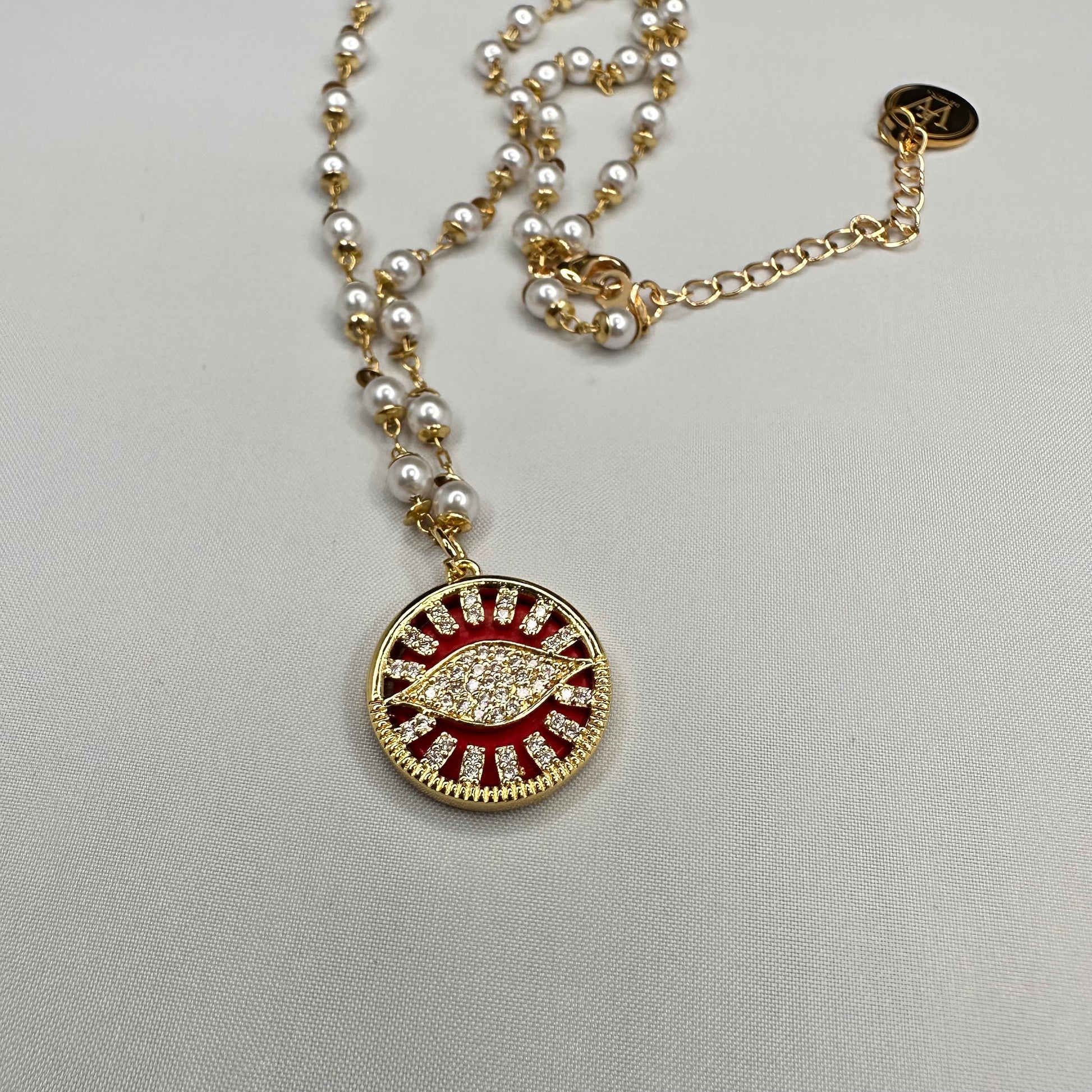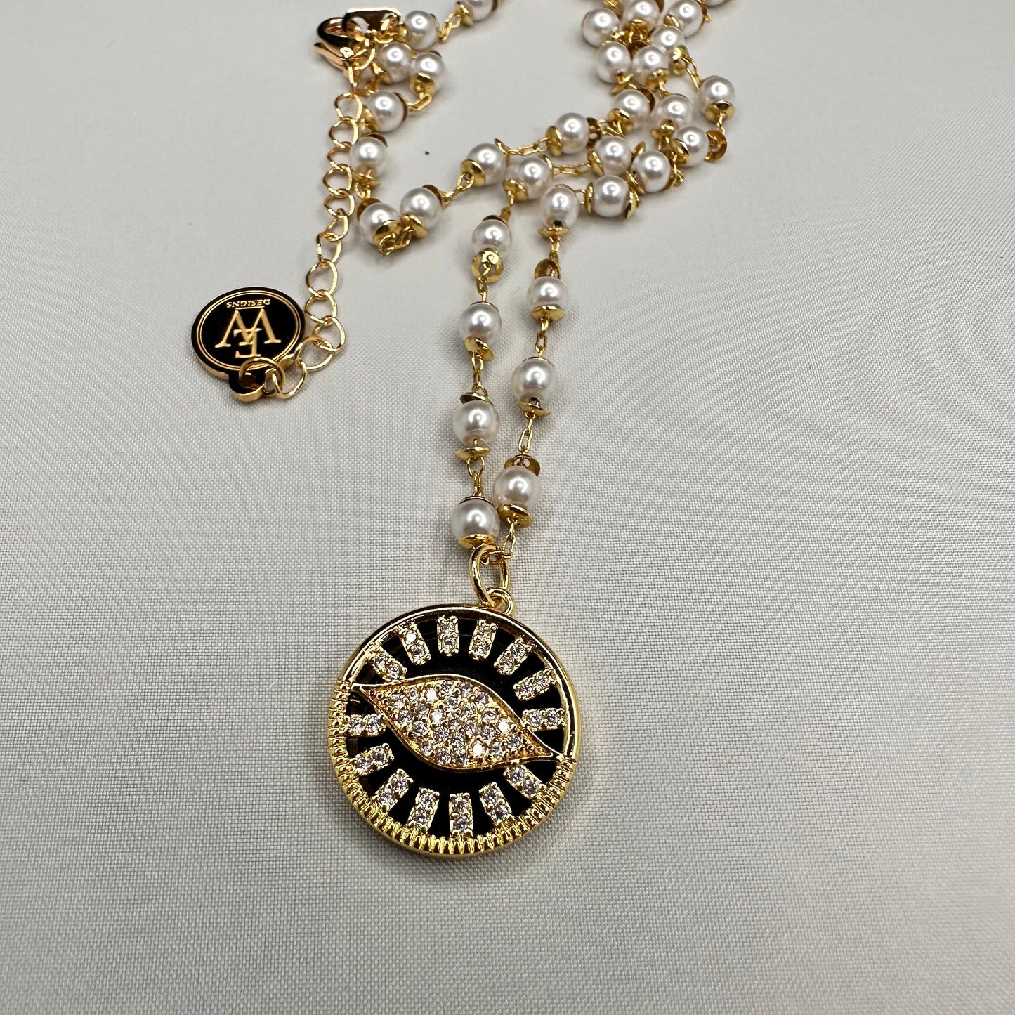 Embrace the alluring charm and positive energy of the Evil Eye with this stunning CZ pendant. With delicate faux pearls set in a dainty necklace, this piece exudes elegance and grace. Let it be a constant reminder of protection and good fortune in your life.