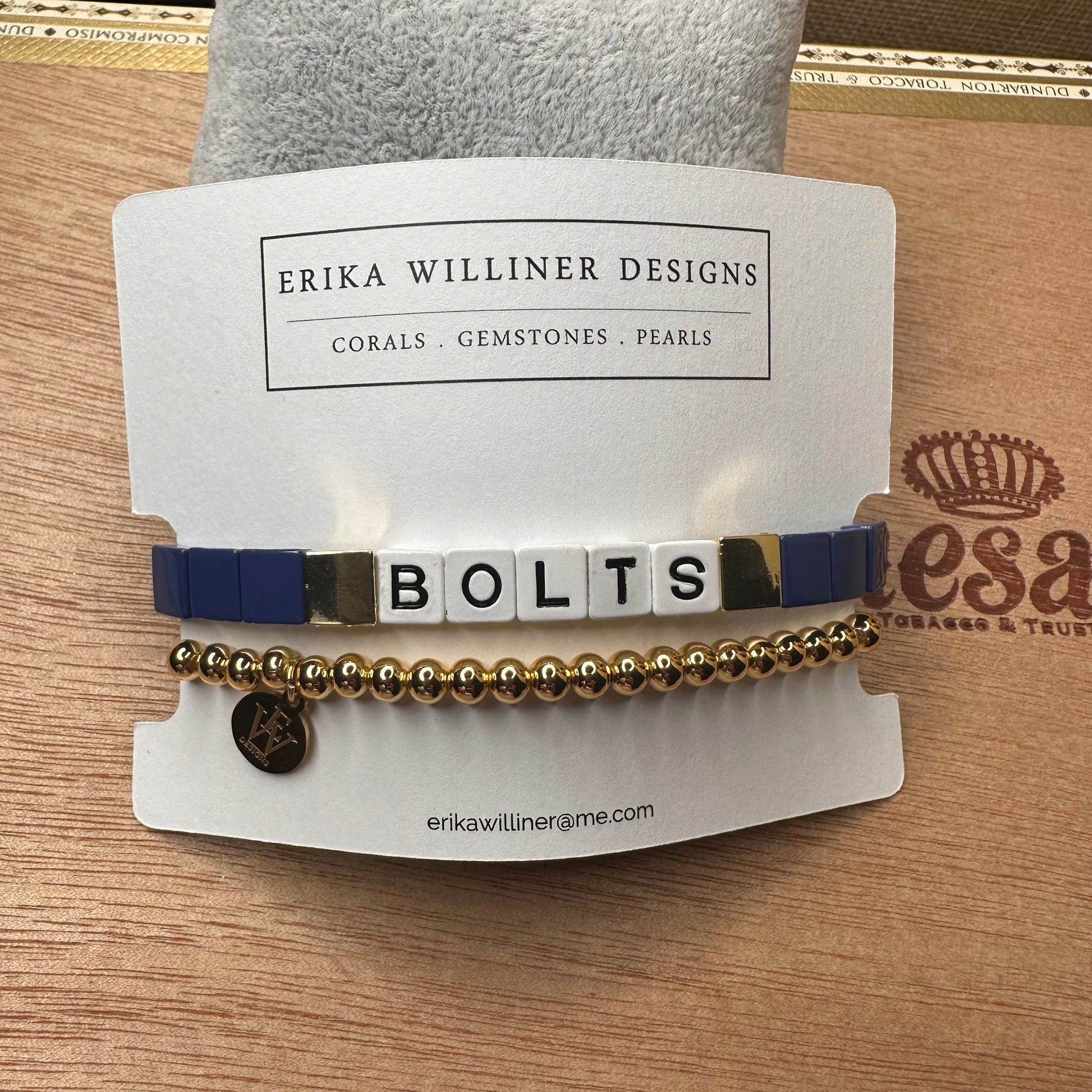 Get ready to bolt into style with this set of 2 bracelets from Erika Williner Designs! Featuring an enameled tile bead bracelet spelling "BOLTS" and a single gold galvanized bead bracelet, these unique pieces will add a fun and playful touch to any outfit.