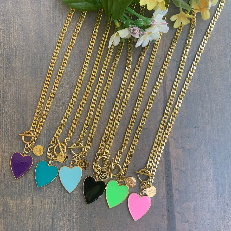 Gold plated necklace with enamel heart pendant 300-3 | Erika Williner Designs Add some sparkle to your life with this heart-shaped enamel pendant necklace! It's a perfect way to show off your style and personality when dressing up for a night out (or even just adding some flair to your everyday look). Plus, the gold plating adds a touch of elegance that will make you feel like the queen (or king) of style.