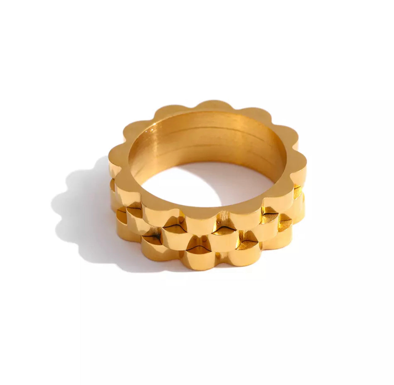 Add a touch of luxury to your outfit with our 18k Gold Plated over Stainless Steel Ring, designed by Erika Williner. This durable and stylish ring will elevate any look, giving you a glamorous and sophisticated edge.