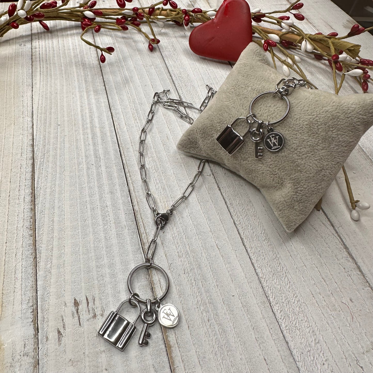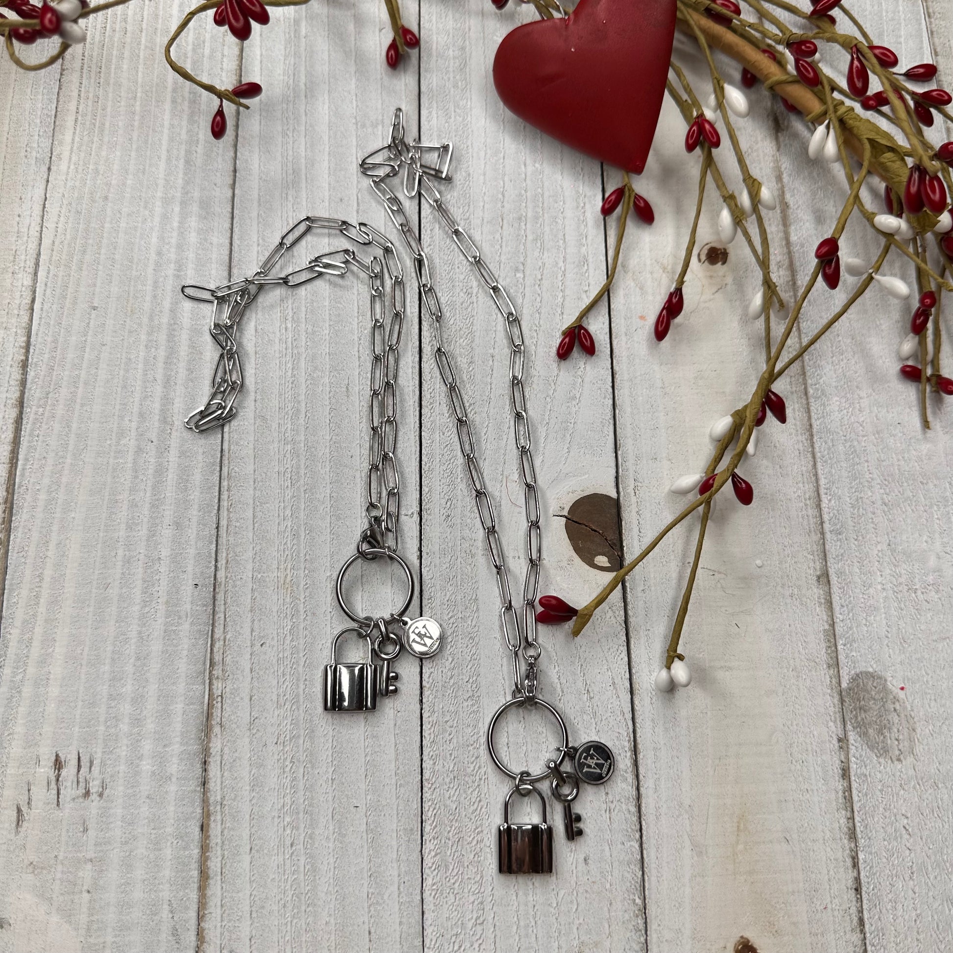 Stainless Steel Paper Clip Link Necklace with a Lock and Key as Charms 300-11 | Erika Williner Designs