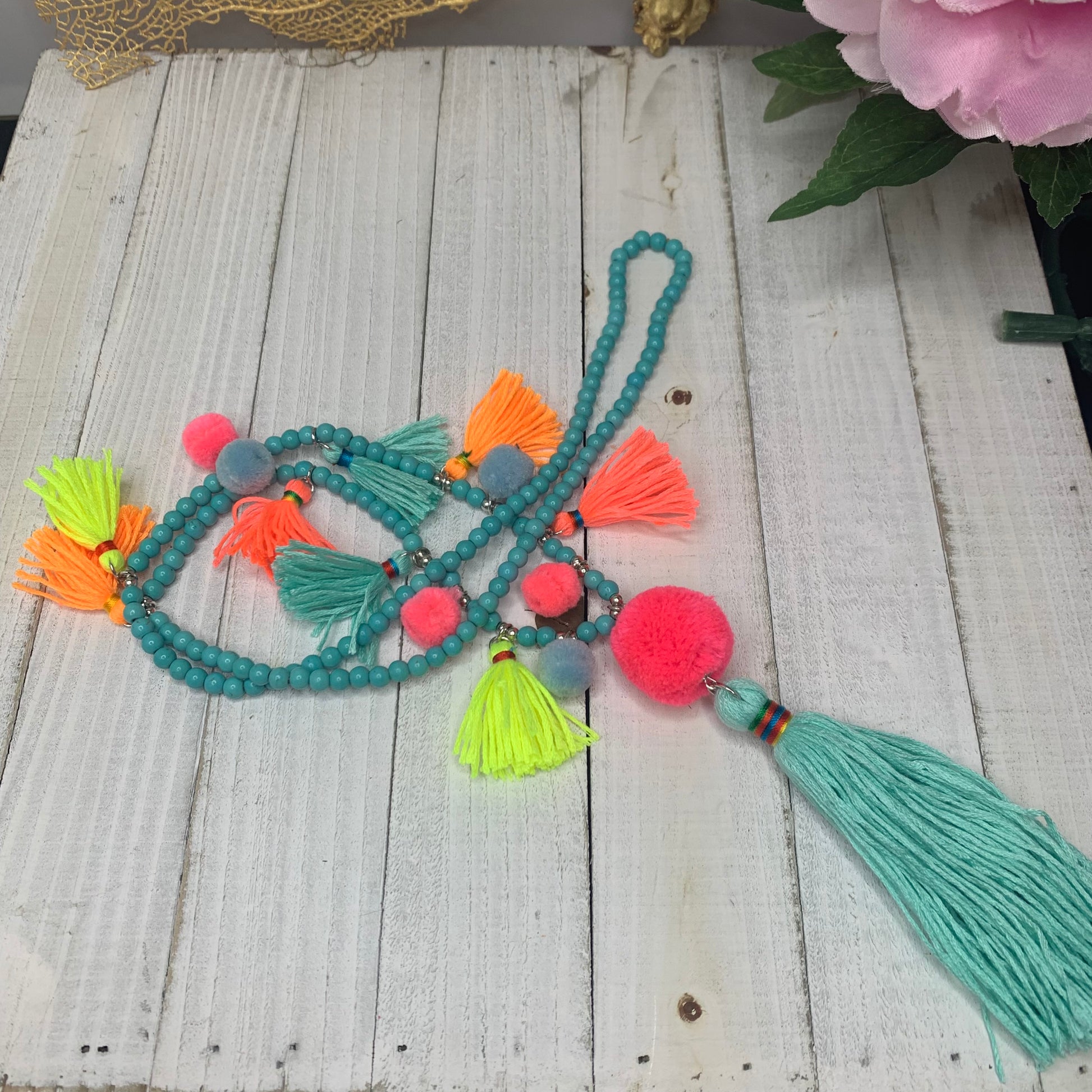 Turquoise Beaded Multicolor Neon Tassel Necklace Make a statement with this one-of-a-kind necklace! Stand out in any crowd and turn heads with this vibrant piece of wearable art.