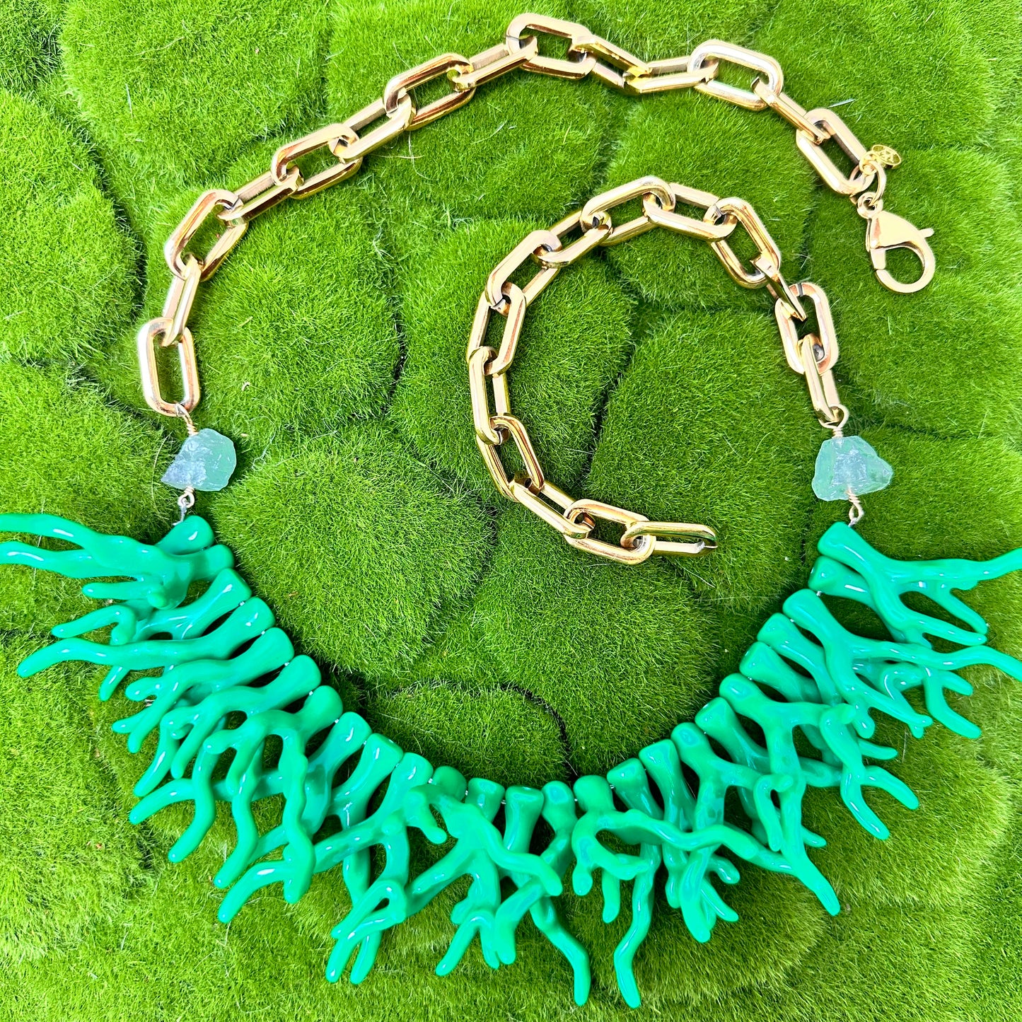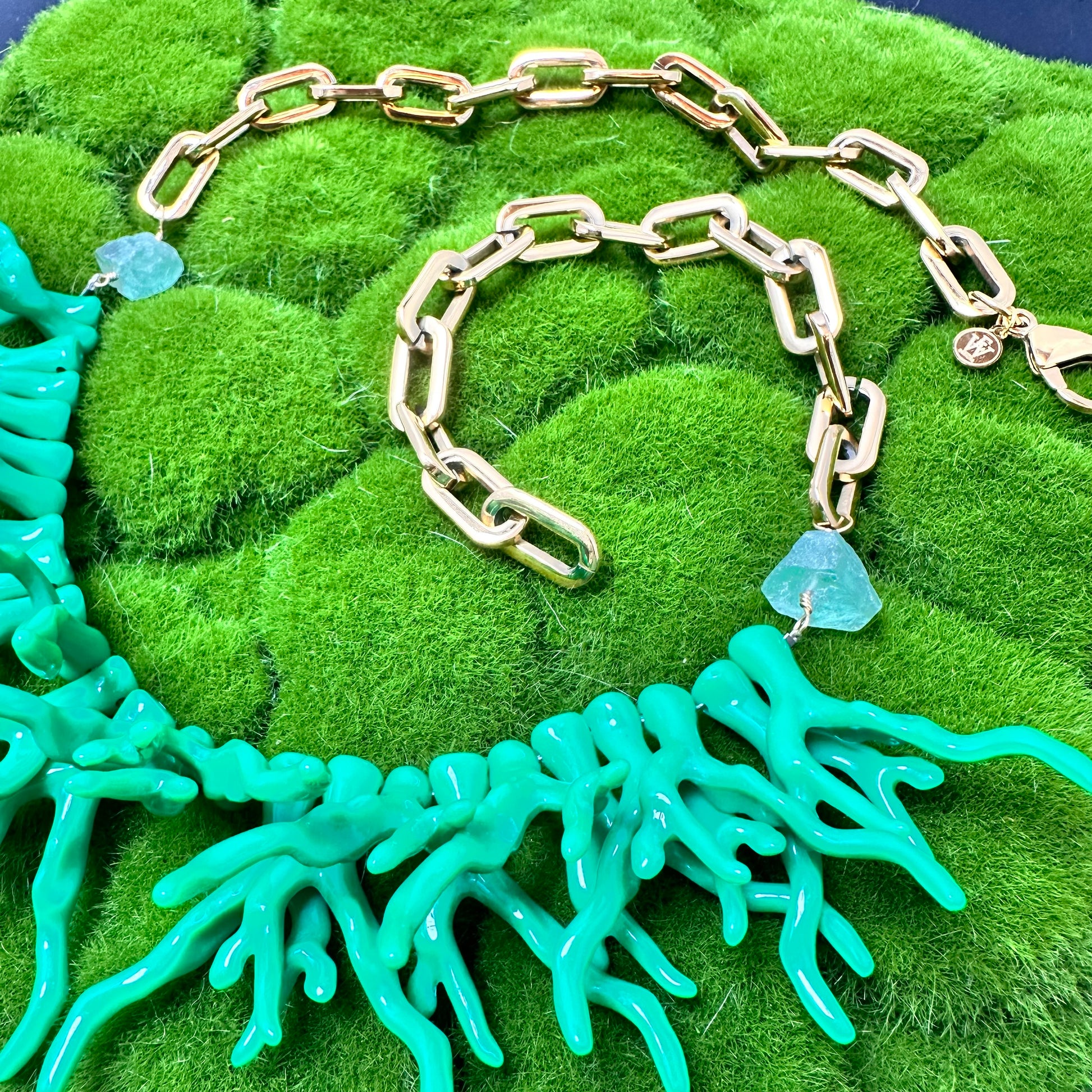 Crafted with exquisite materials and a keen eye for detail, this one-of-a-kind necklace features Green Acetate Coral Branches and Fluorite Beads, complemented by the luxurious touch of Gold Plated Stainless Steel Chain. Elevate your style and embrace the utmost elegance with Erika Williner Designs.