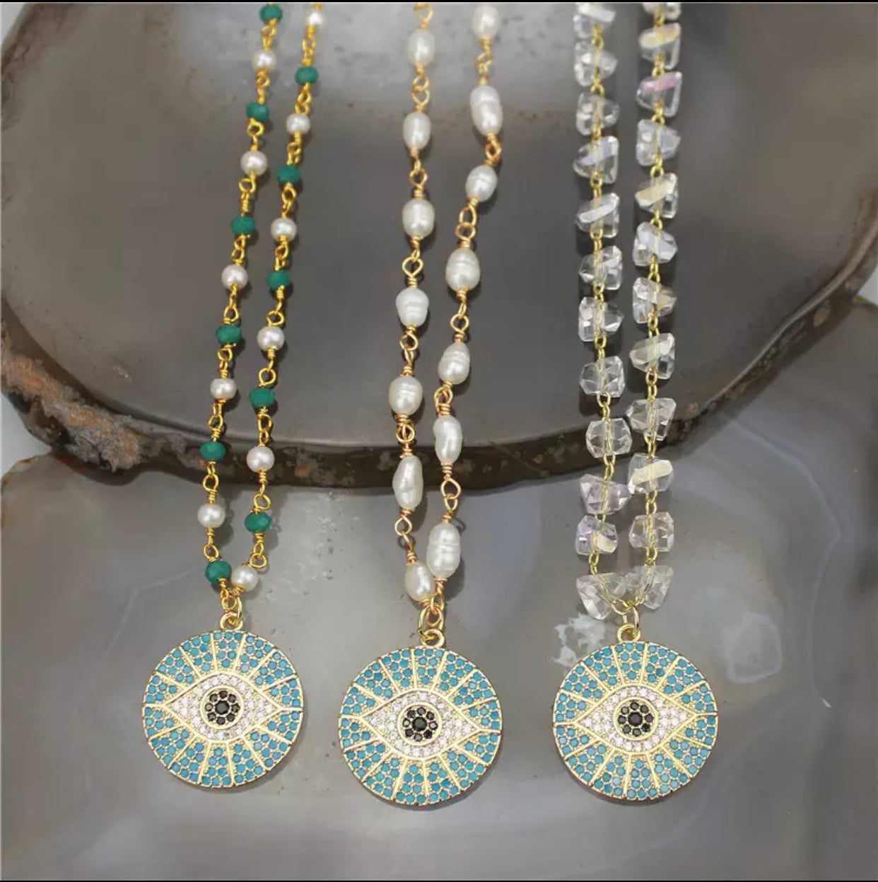 Add a touch of whimsy and sparkle to your outfit with this beautiful chain featuring a pave crystal evil eye round pendant. Protect yourself from negative energy in style with the trendy and playful design. Elevate your look with this unique and eye-catching accessory by Erika Williner Designs.