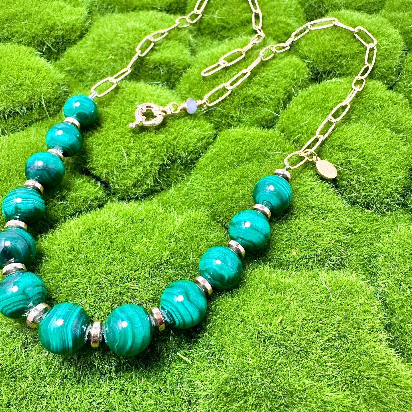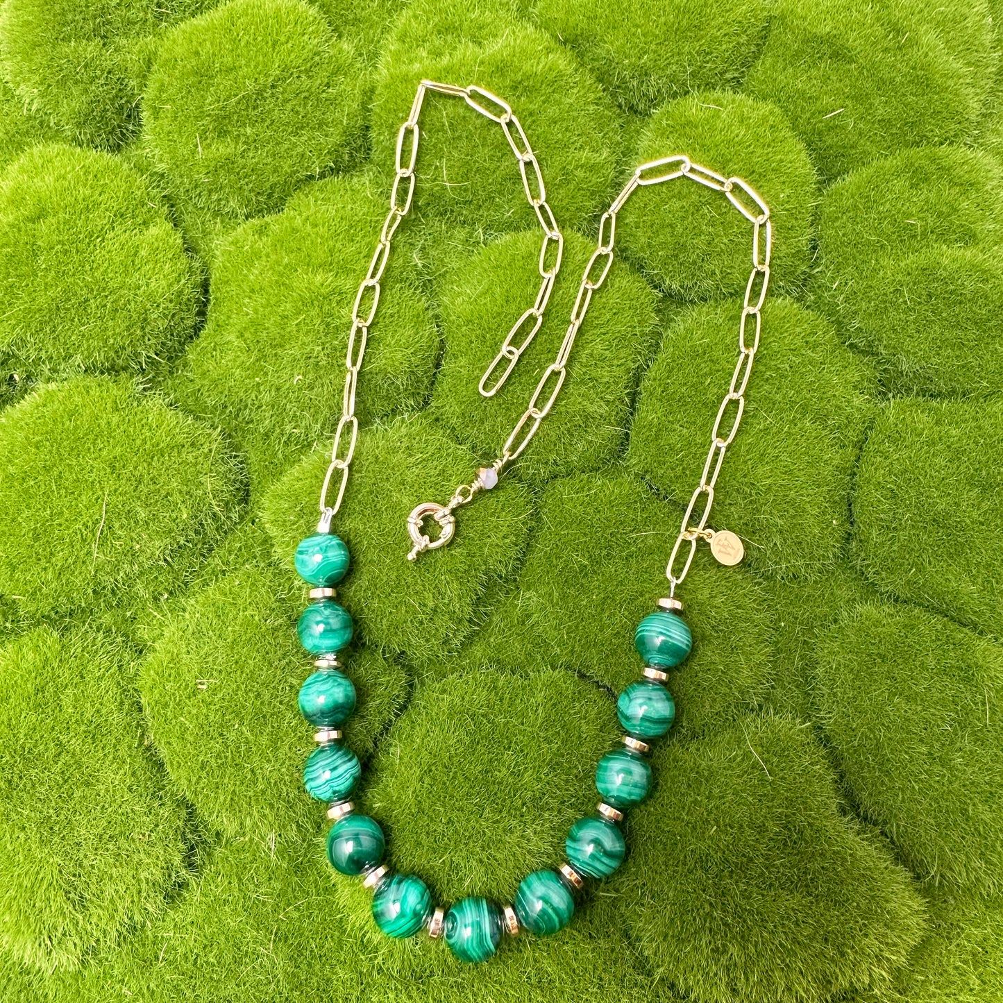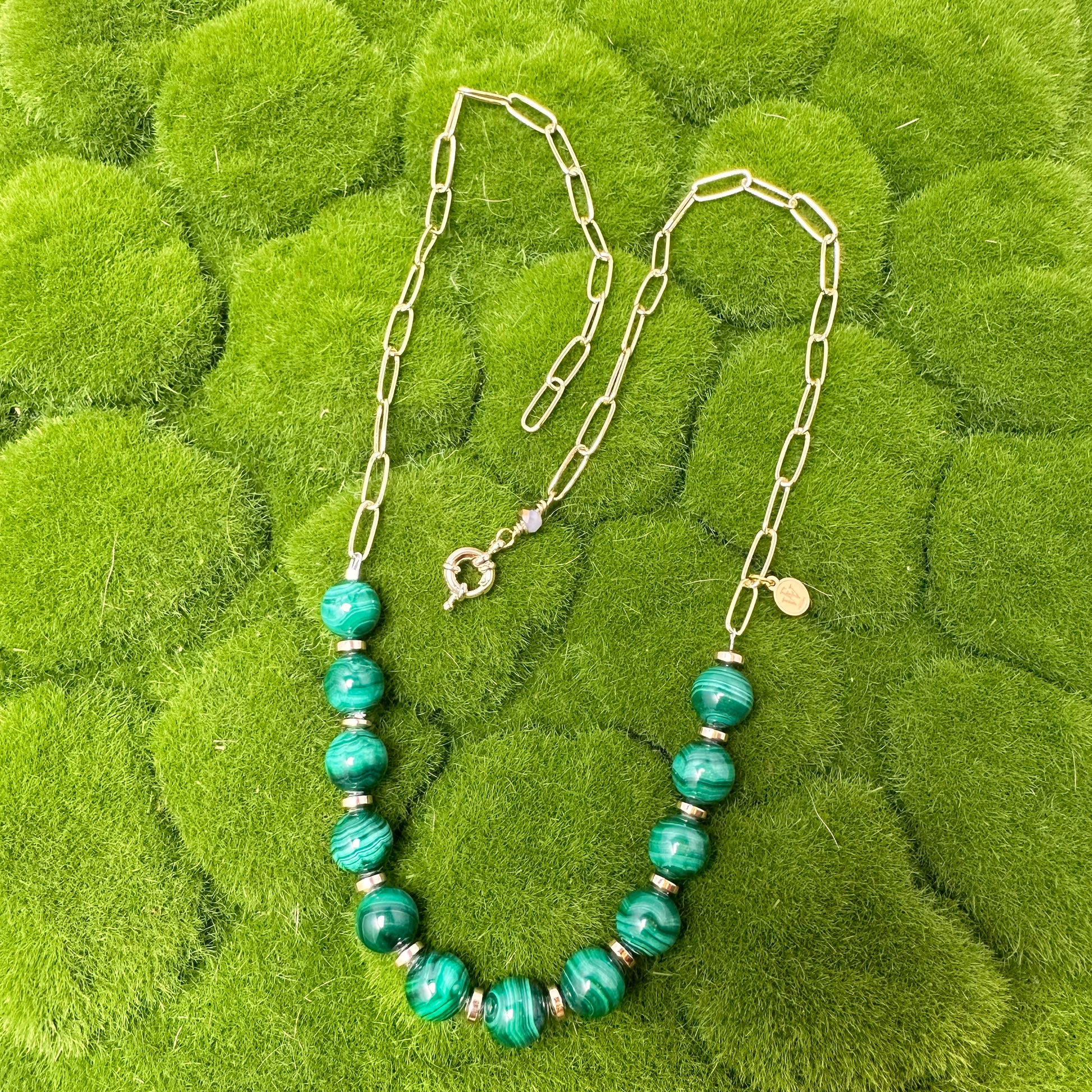 This stunningly sophisticated necklace features hand-cut malachite beads adorned with a polished stainless steel chain. Crafted by renowned designer Erika Williner, this necklace embodies the perfect blend of premium materials and timeless design. With its rich green hues and sleek, durable chain, it's an exquisite piece that will elevate any outfit, making it a must-have addition to your jewelry collection. Indulge in the art of luxury and elevate your style with this exquisite necklace.