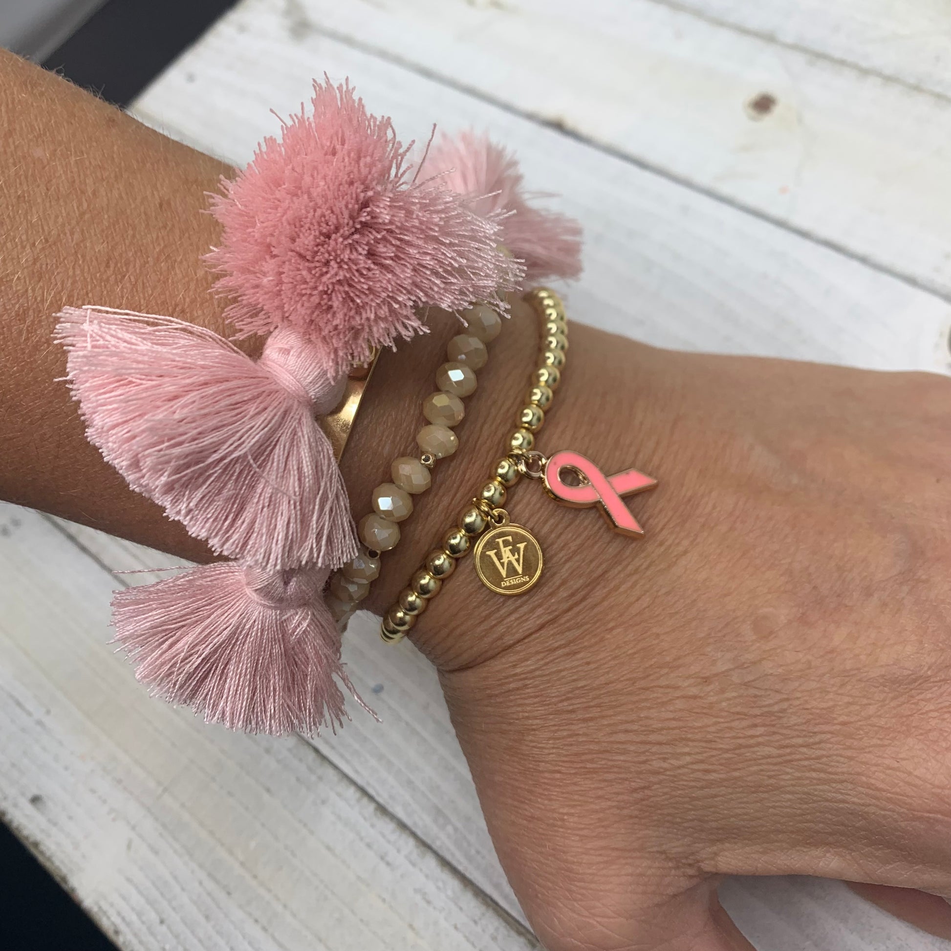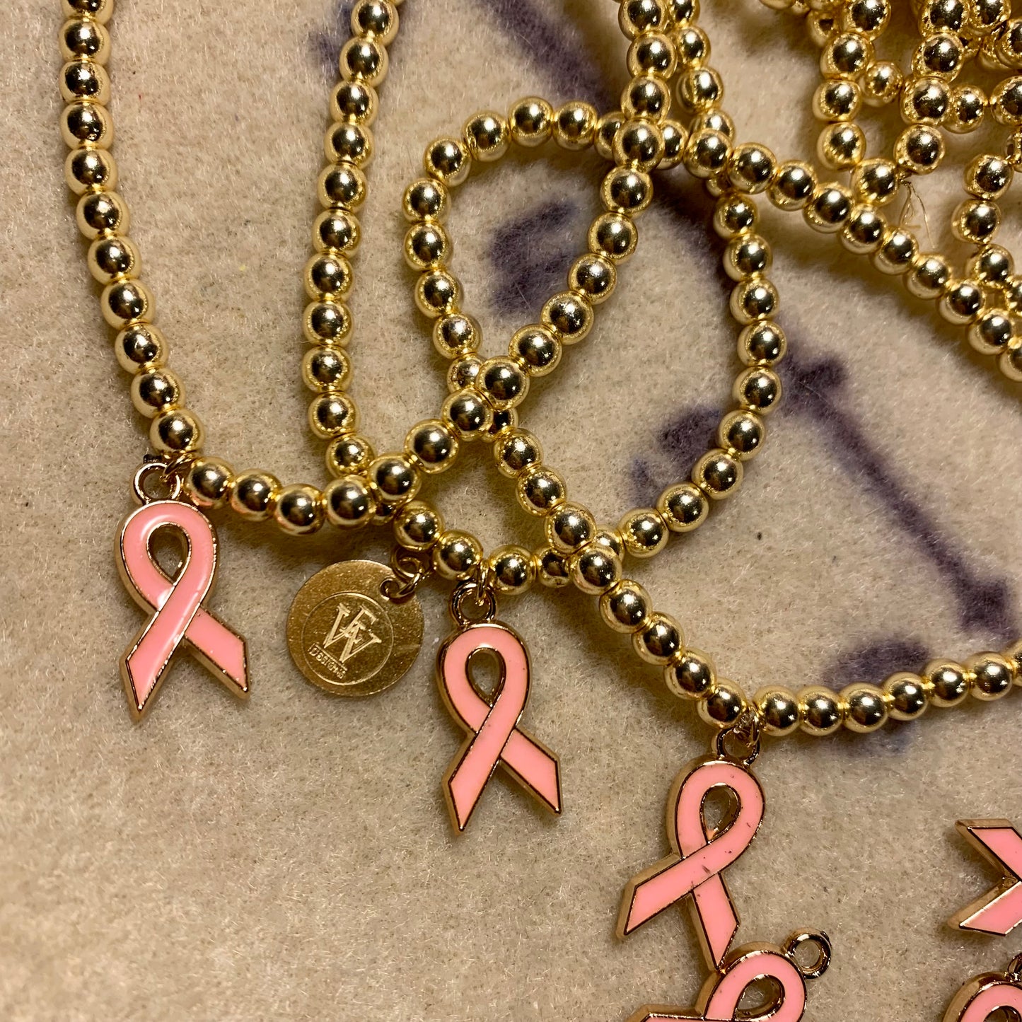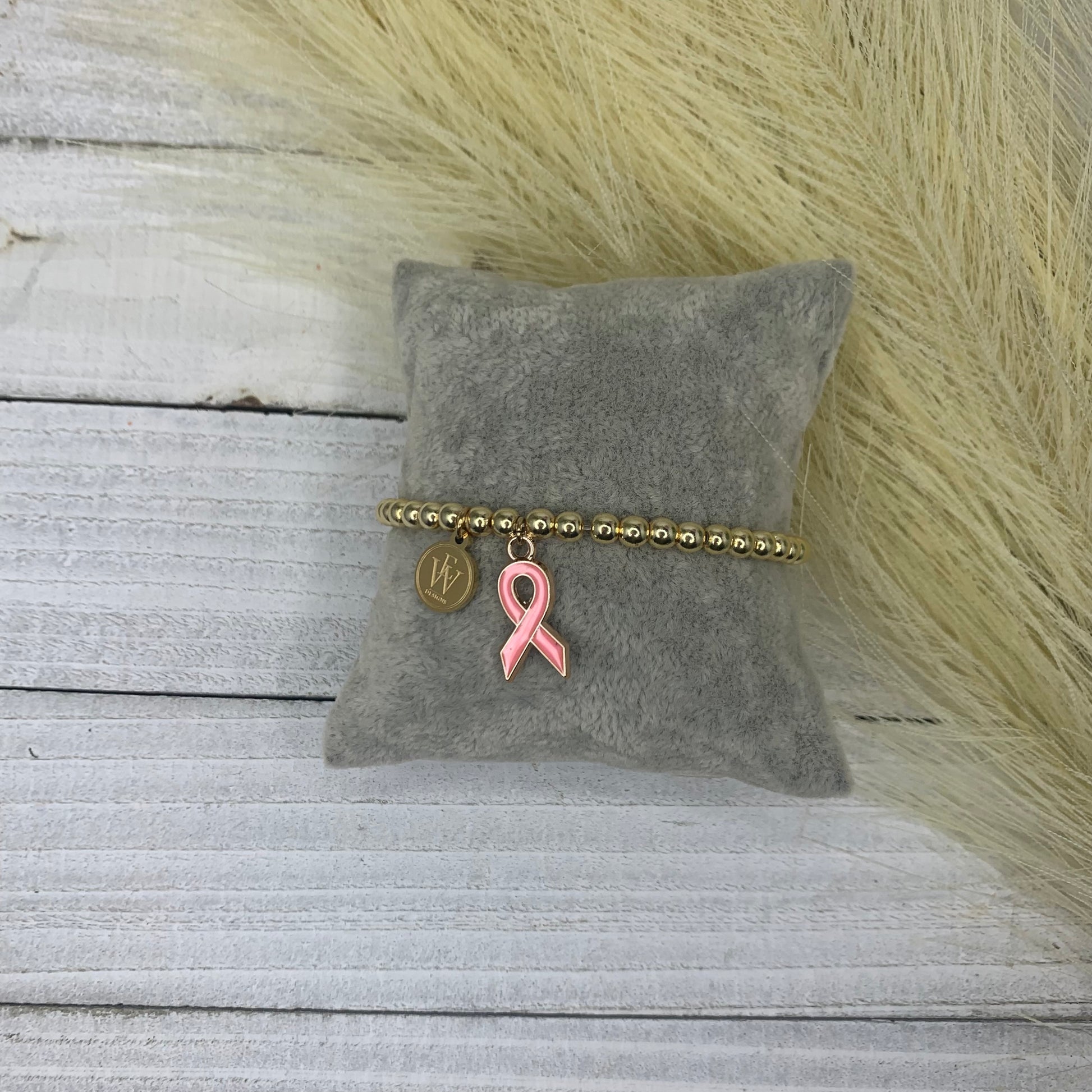 Show your support for breast cancer awareness with this stylish stretchy bracelet, featuring gold filled round beads and a playful pink ribbon charm. Not only will you be making a statement, but you'll also be giving back to a great cause! (It's a win-win, really!)