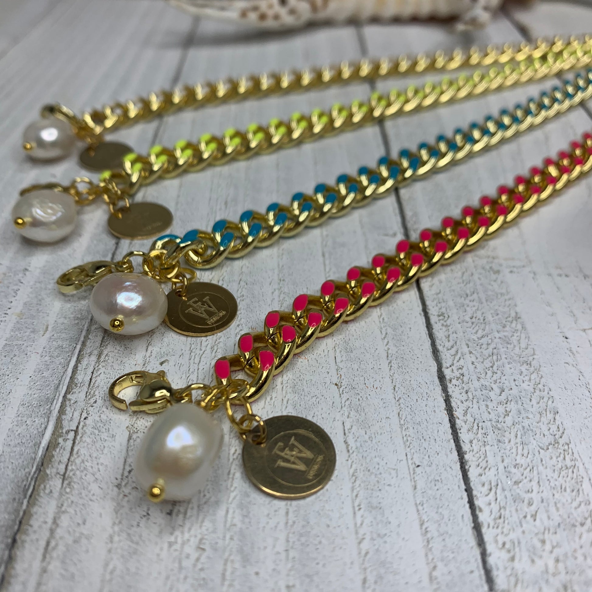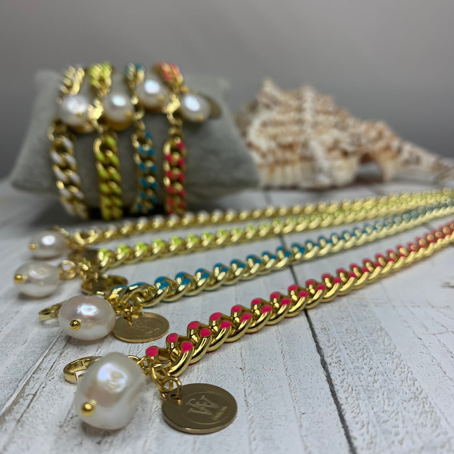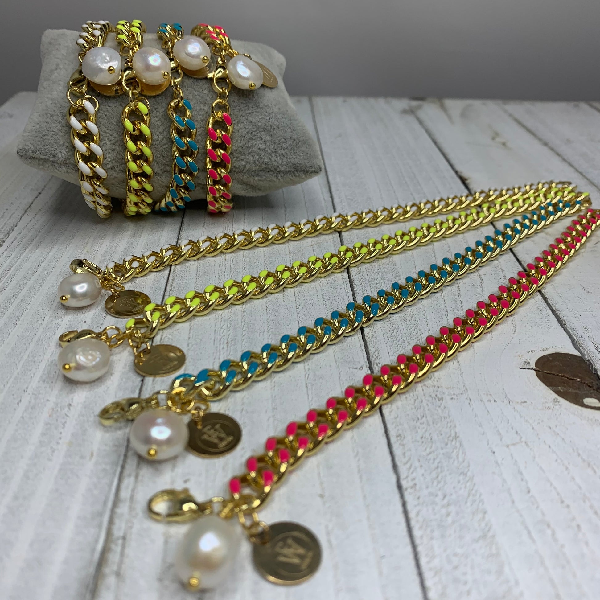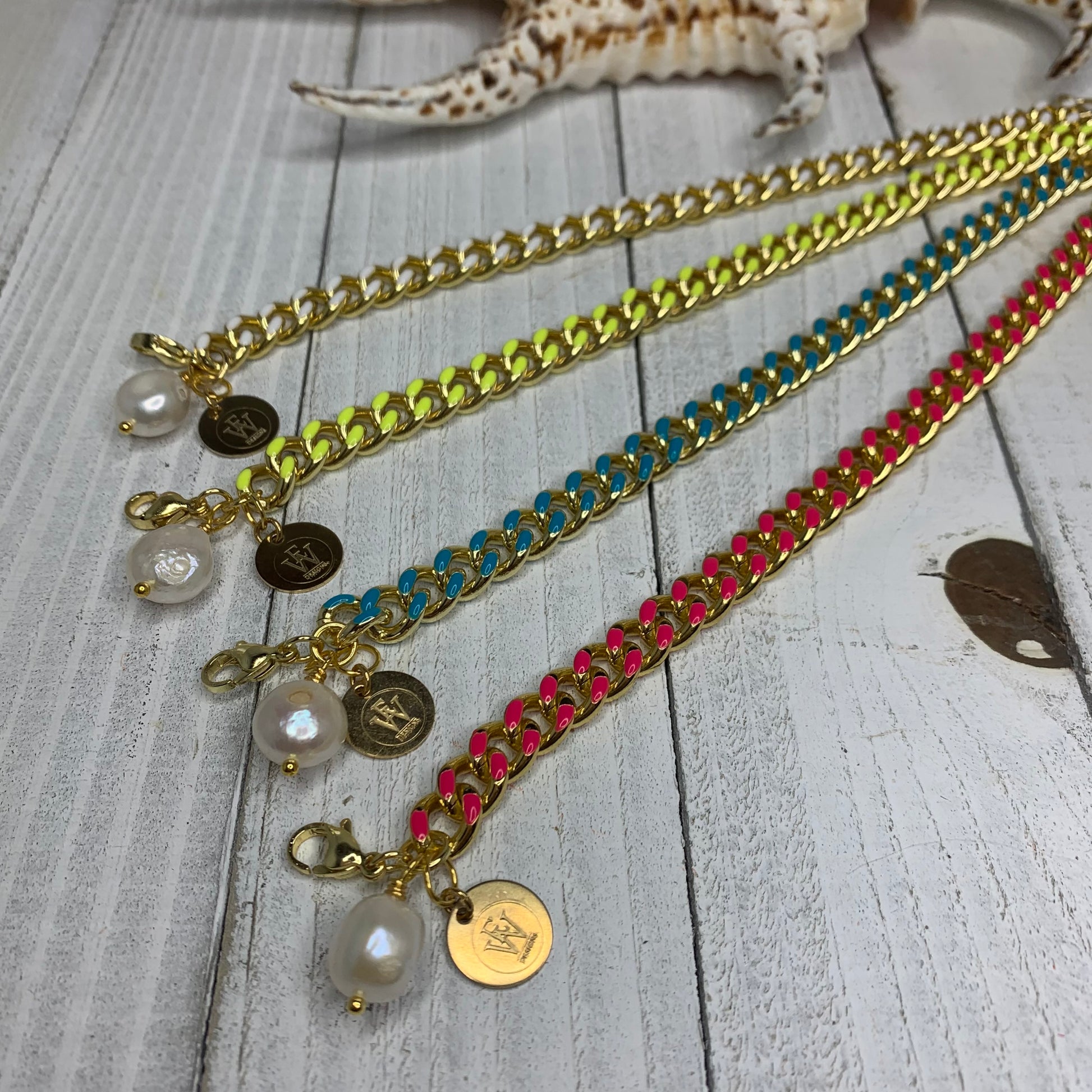 Upgrade your jewelry game with this 14k gold-plated chain that rocks neon enamel embellishments. And as if that wasn't enough, it also comes with a chic fresh water pearl charm and our signature logo charm. Talk about bang for your buck!