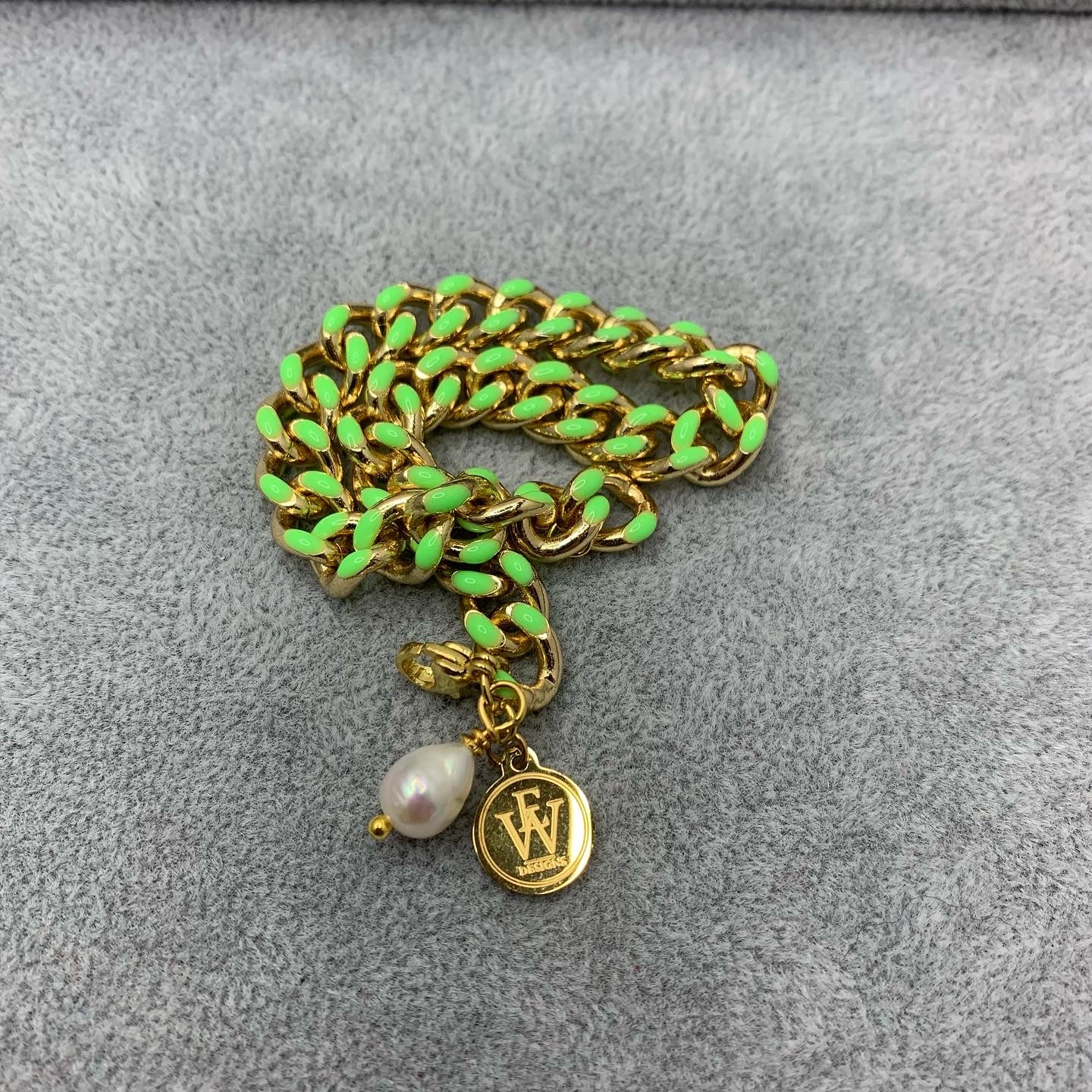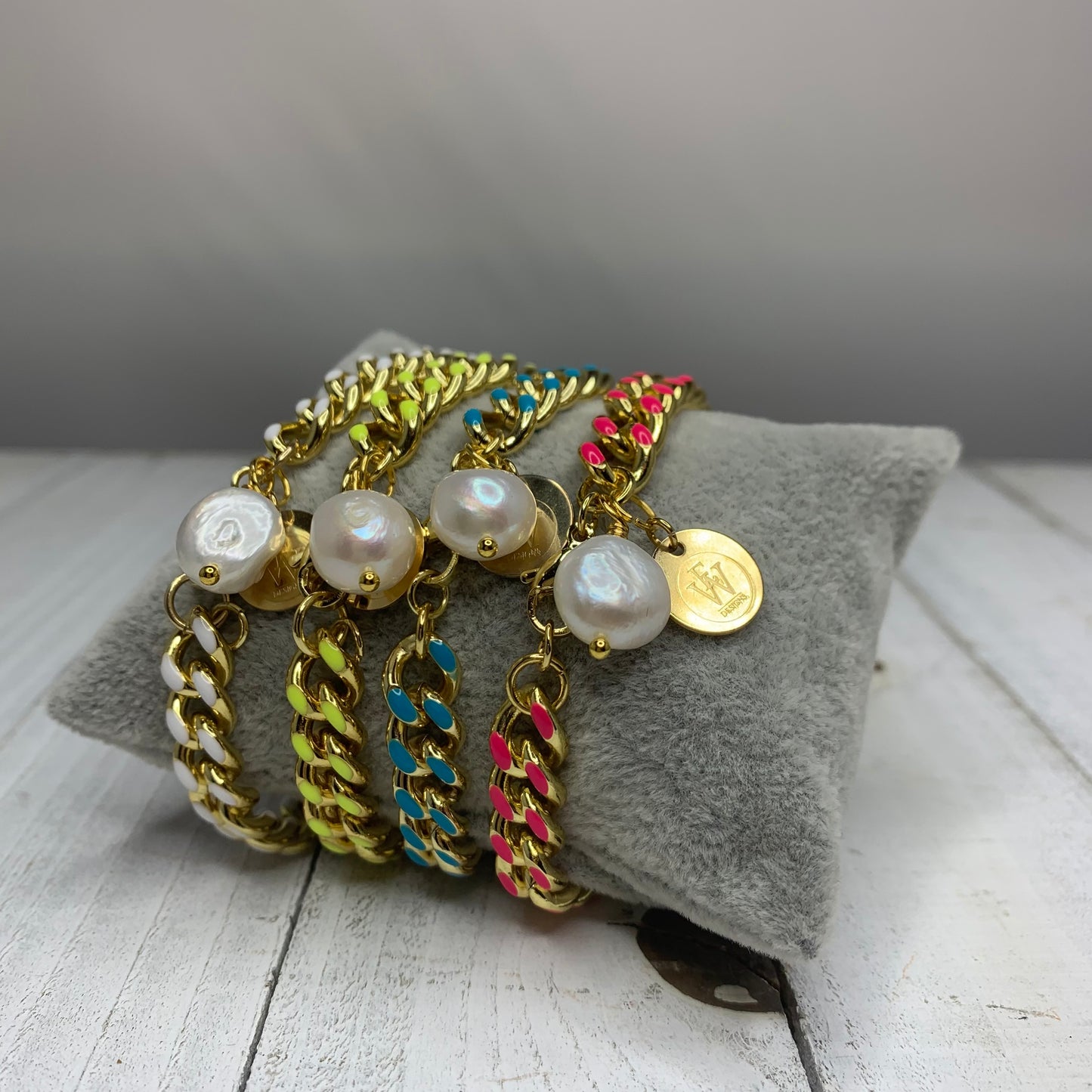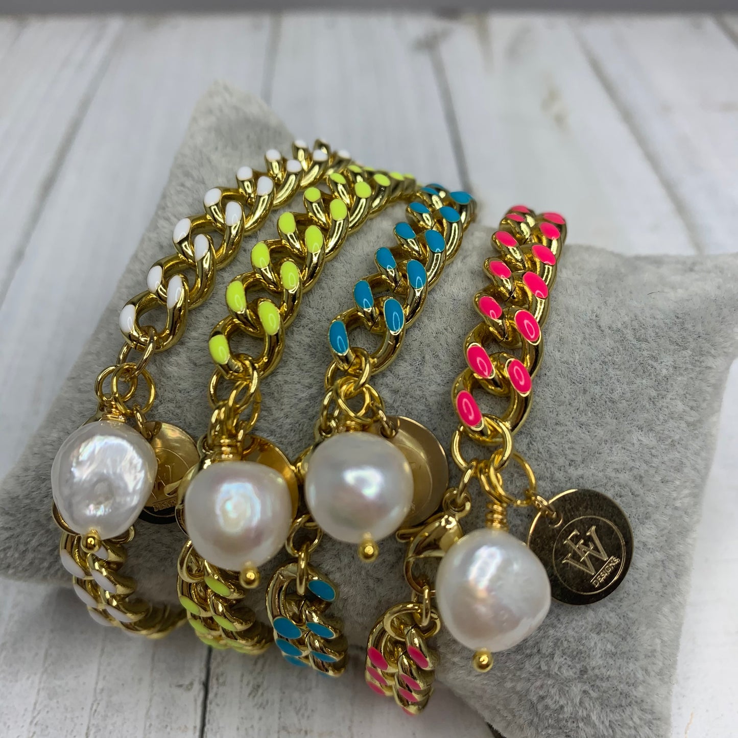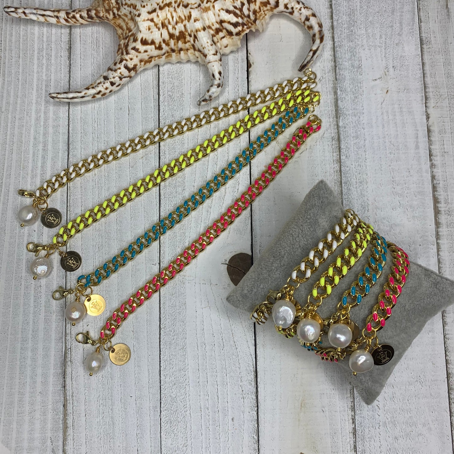 Upgrade your jewelry game with this 14k gold-plated chain that rocks neon enamel embellishments. And as if that wasn't enough, it also comes with a chic fresh water pearl charm and our signature logo charm. Talk about bang for your buck!