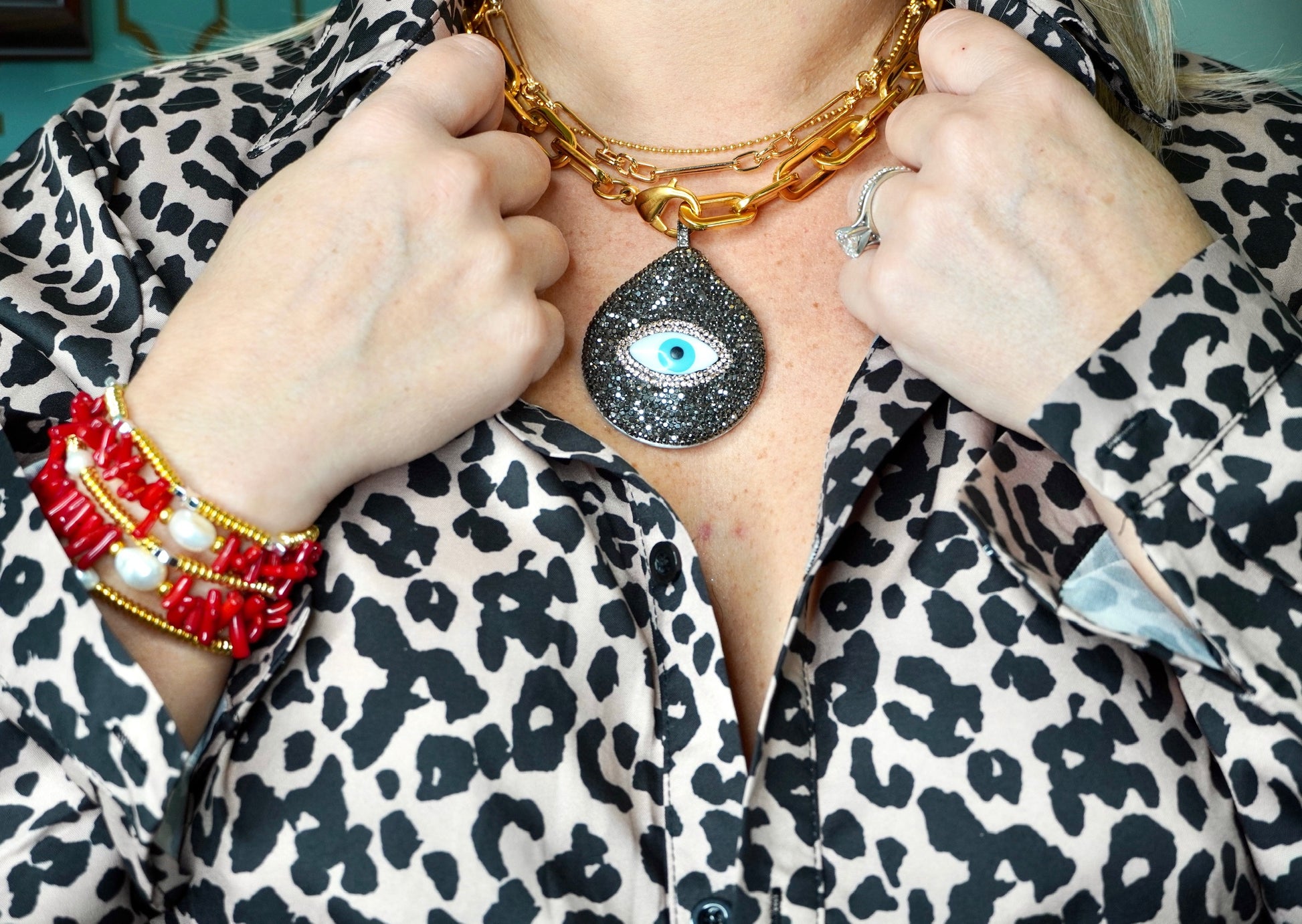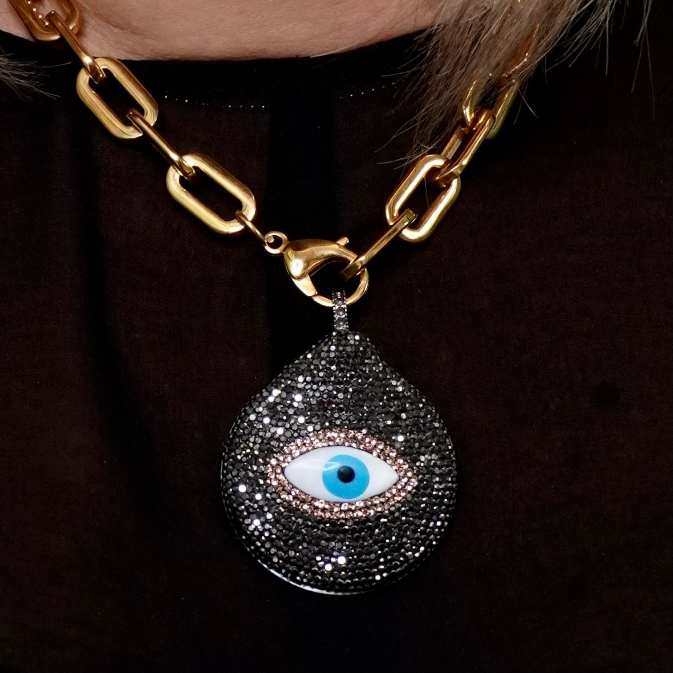 Stand out in style with our Gold Plated Chain Link Necklace featuring a Mother of Pearl Pendant adorned with Pavé Crystals and a striking Evil Eye detail. Trendy and charming, this necklace will add a touch of elegance to any outfit. Don't be afraid to catch some envious glances!