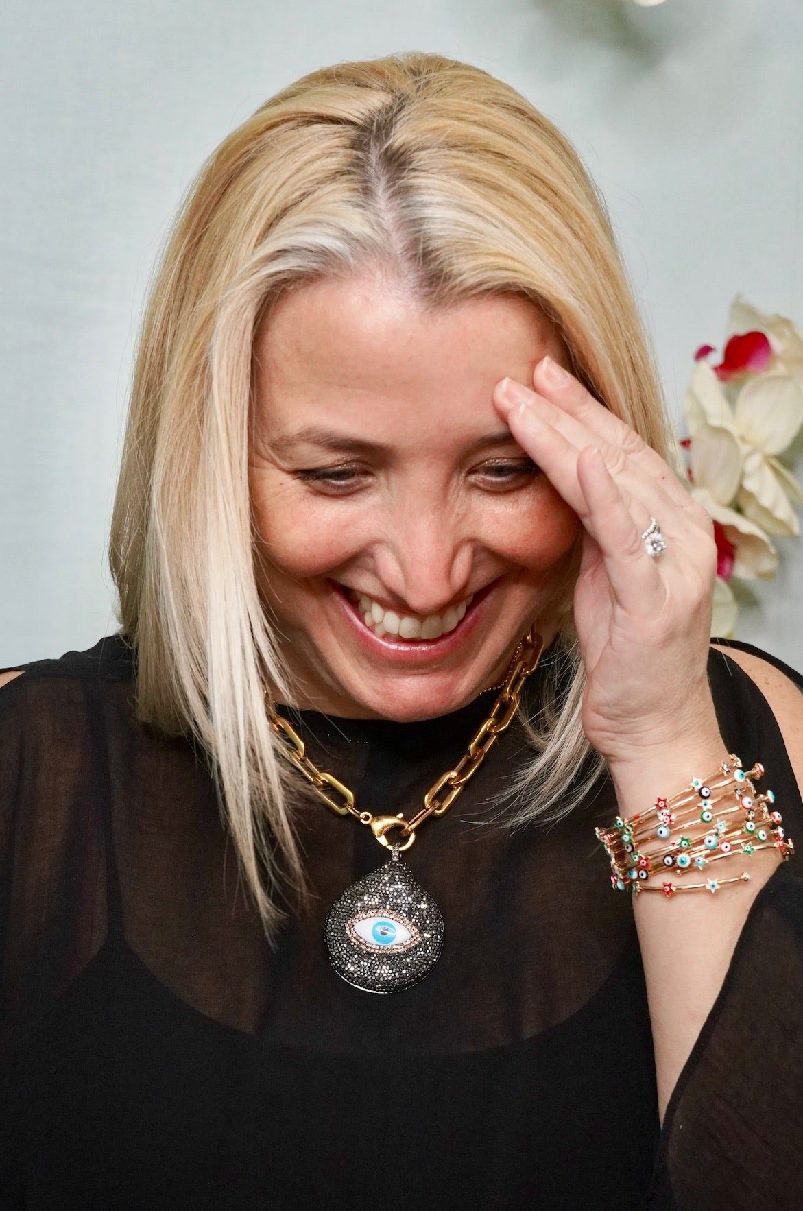 Gold Plated Chain Link Necklace it has a Mother of Pearl Pendant Embellished with Pave Crystals and an Evil Eye 310-21 |Erika Williner Designs