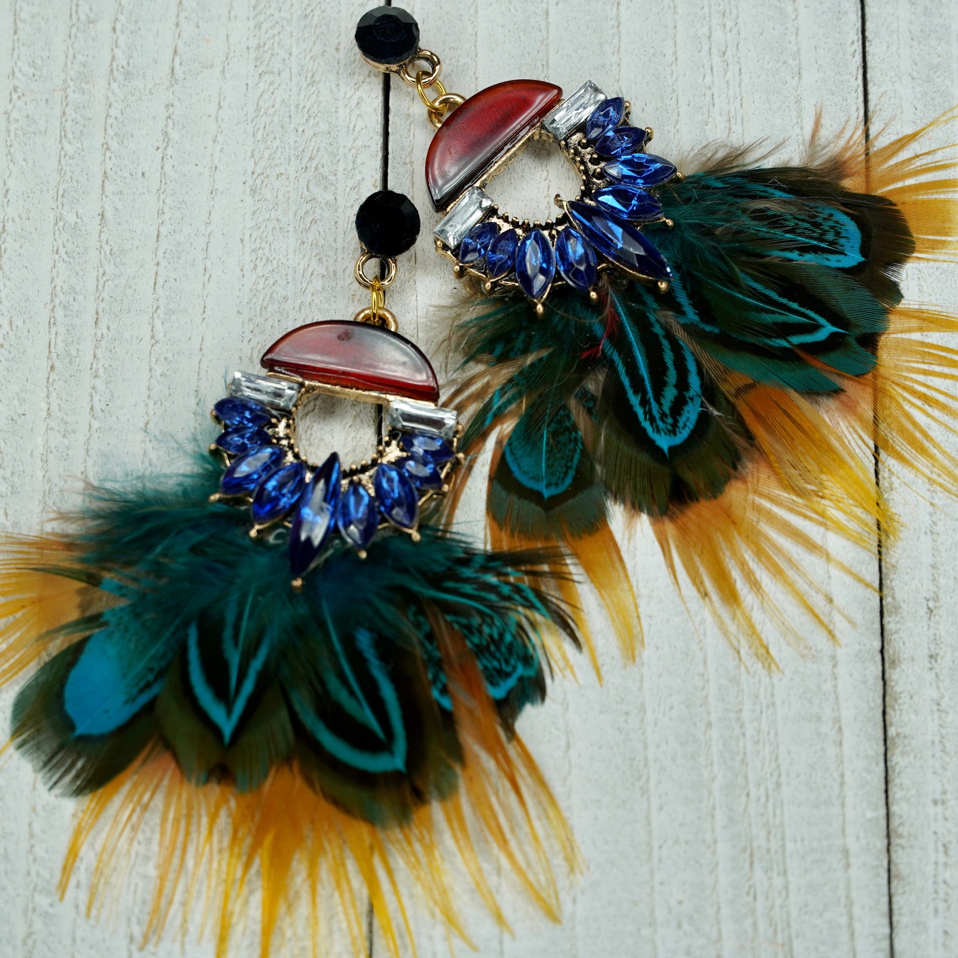 Elevate your accessories with these stunning Aztec-inspired Peacock Feather Earrings, featuring a striking combination of vivid Maroon and Sunset hues.