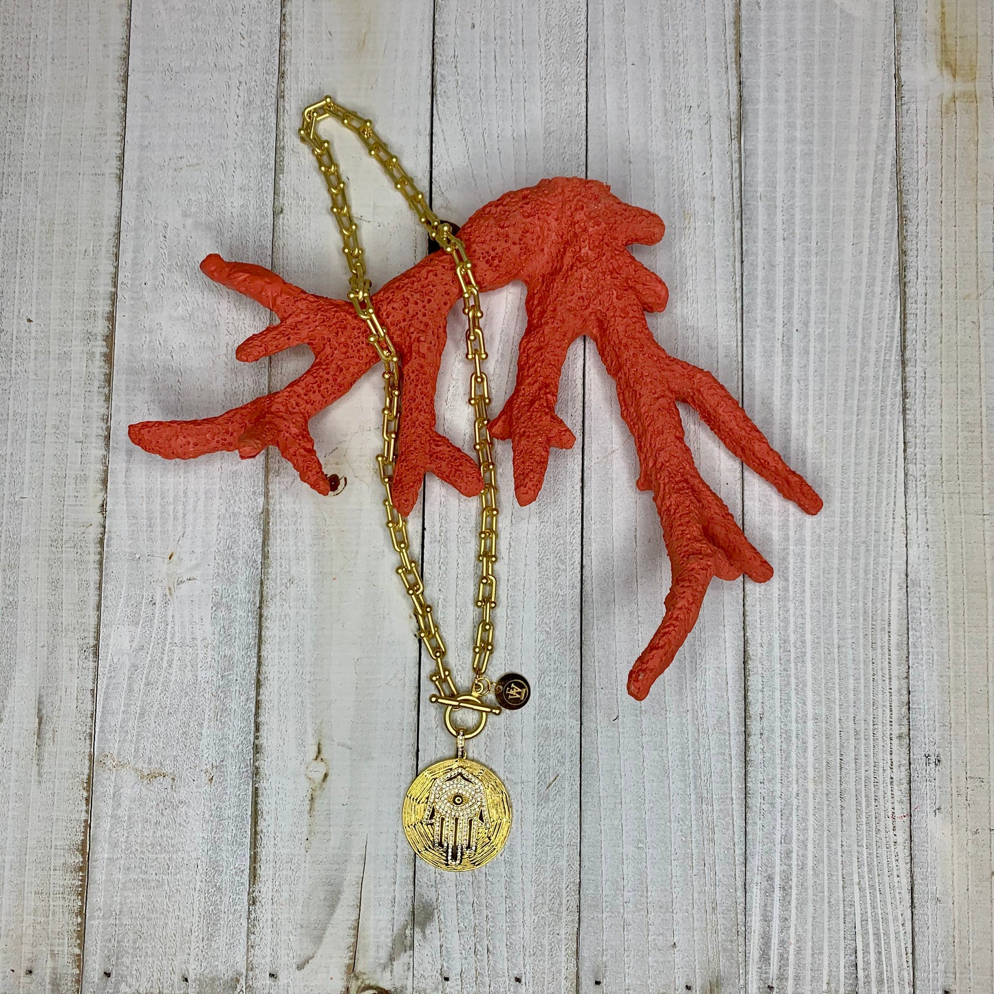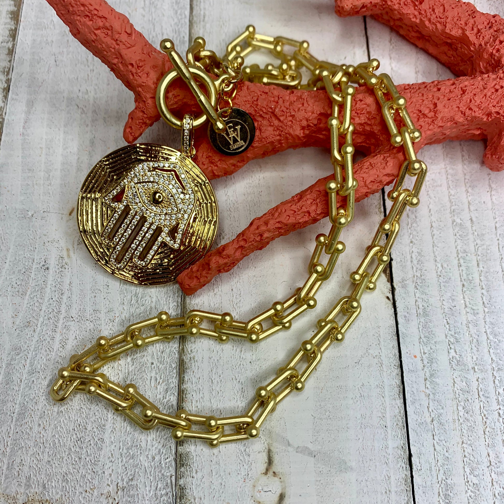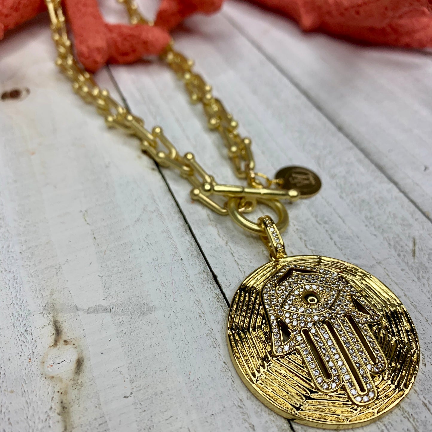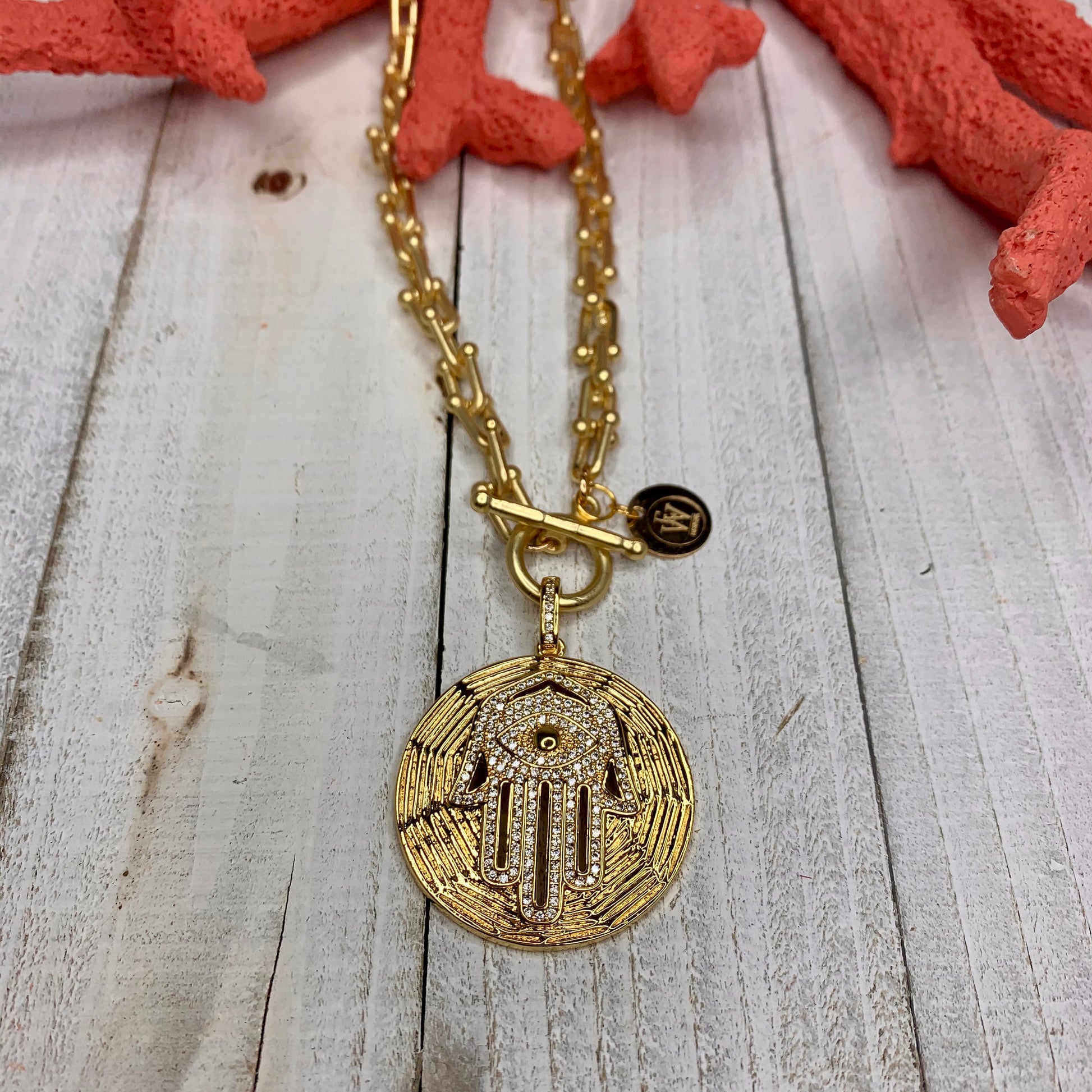 Tiffany's Style Chain in Sanded Gold Necklace with Hand of Fatima Pendant 300-26 | Erika Williner Designs