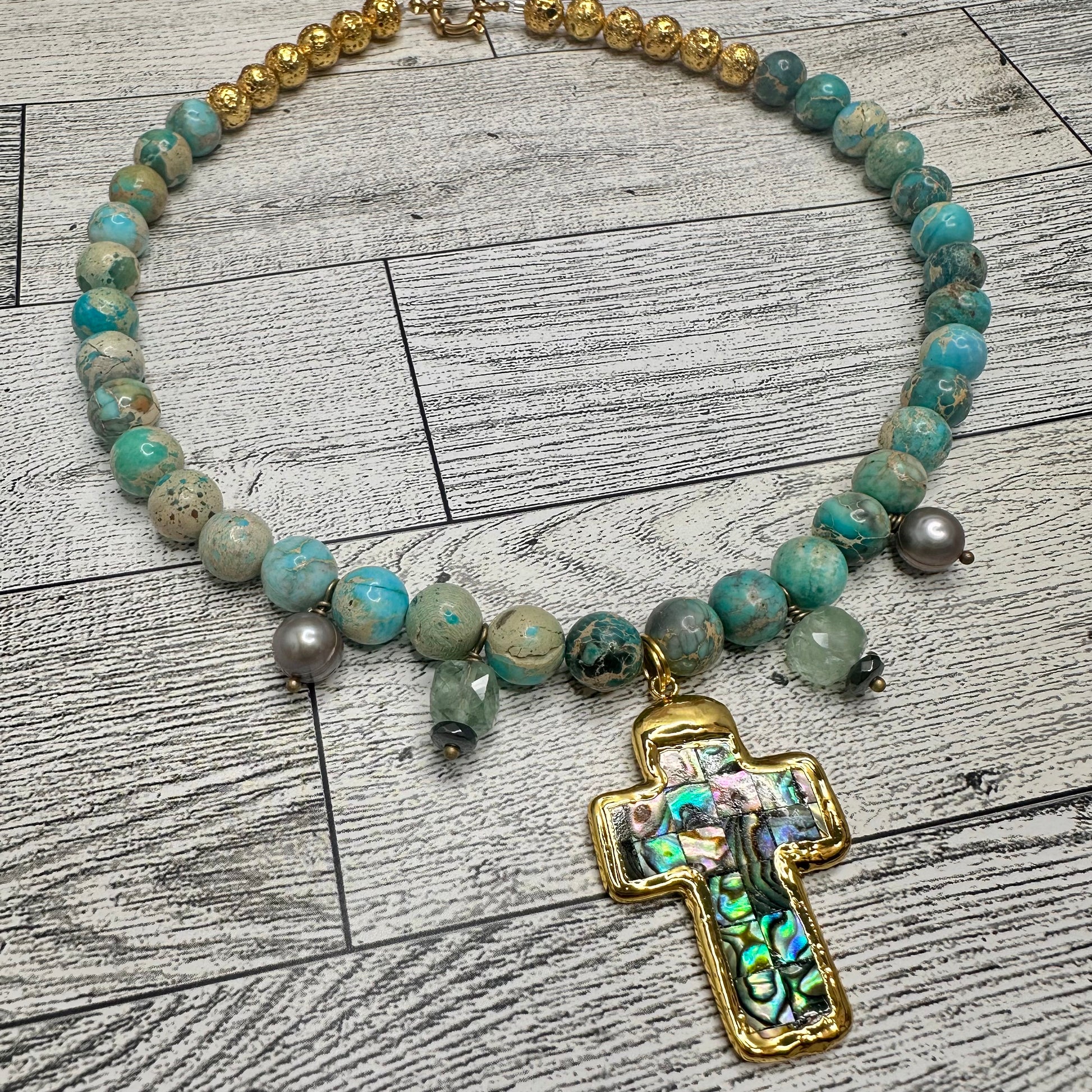 Turquoise, Aquamarine and Gray Pearls necklace with Abalone Cross | Erika Williner Designs