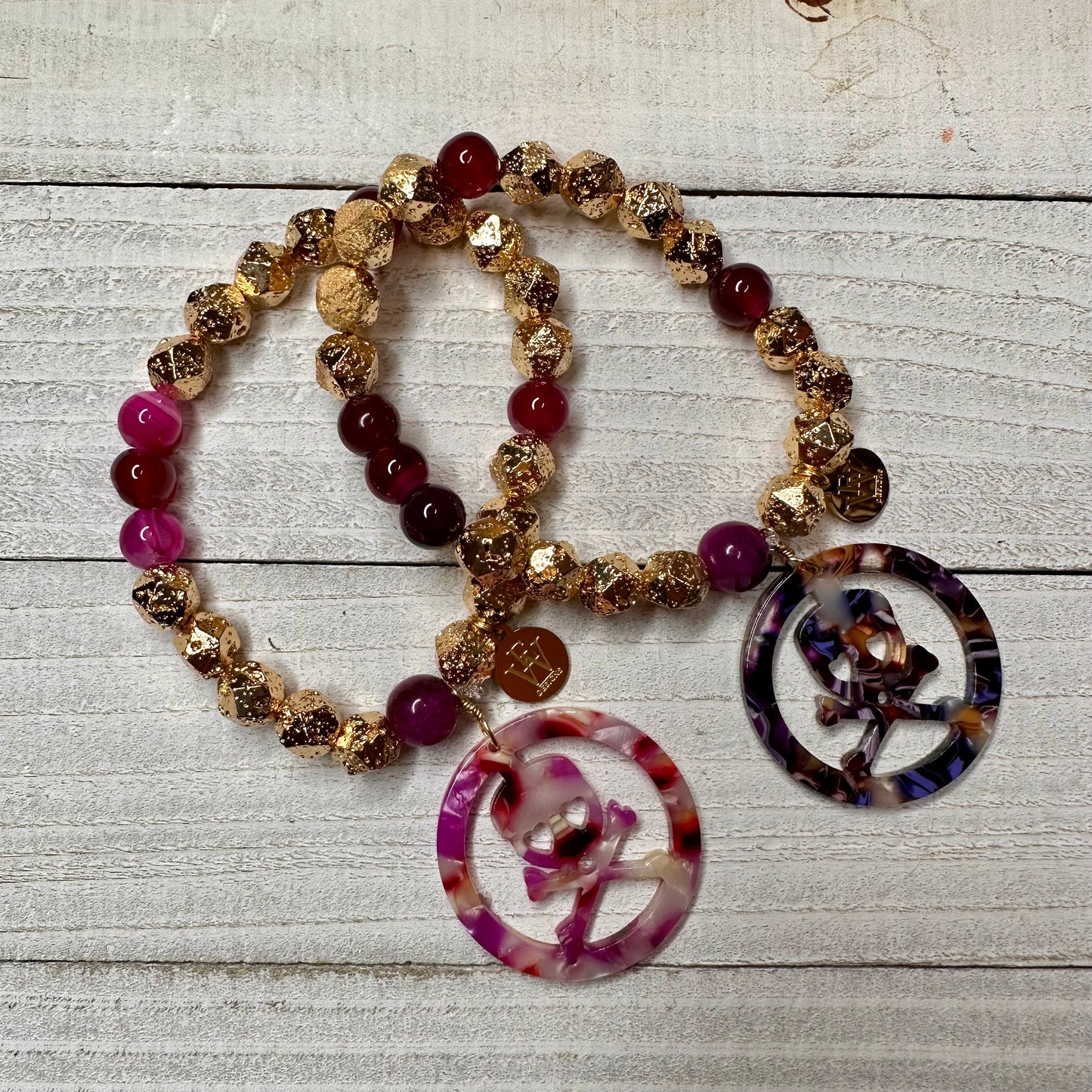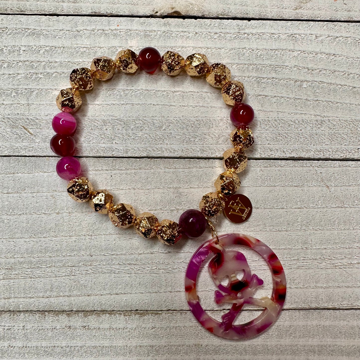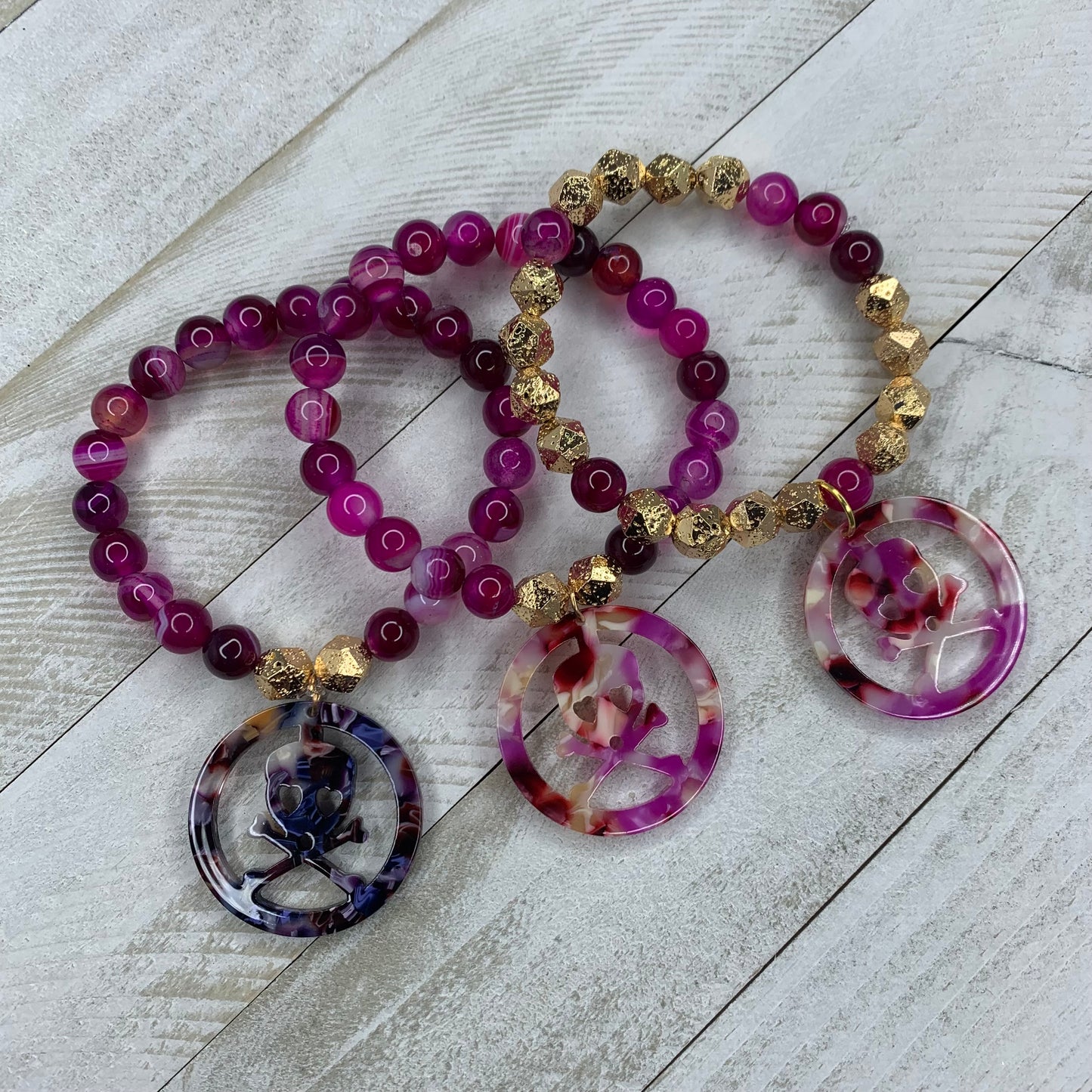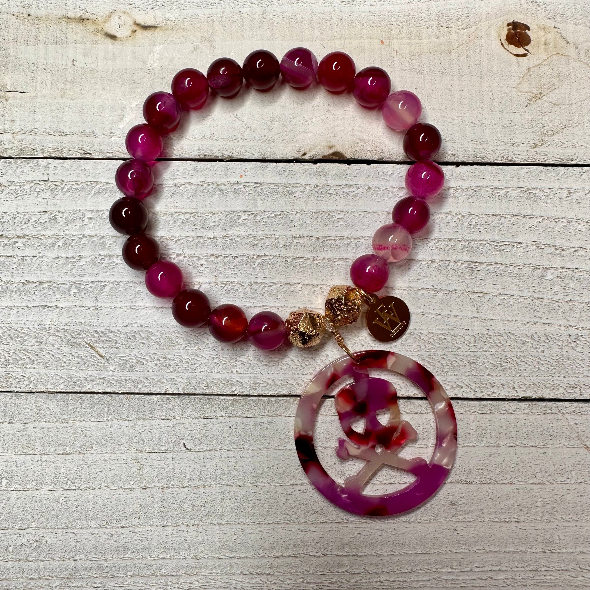 This Erika Williner Designs bracelet is made out of 6mm hot pink agate beads, 8mm gold plated hematite beads and an acetate crossed bones and skull charm.