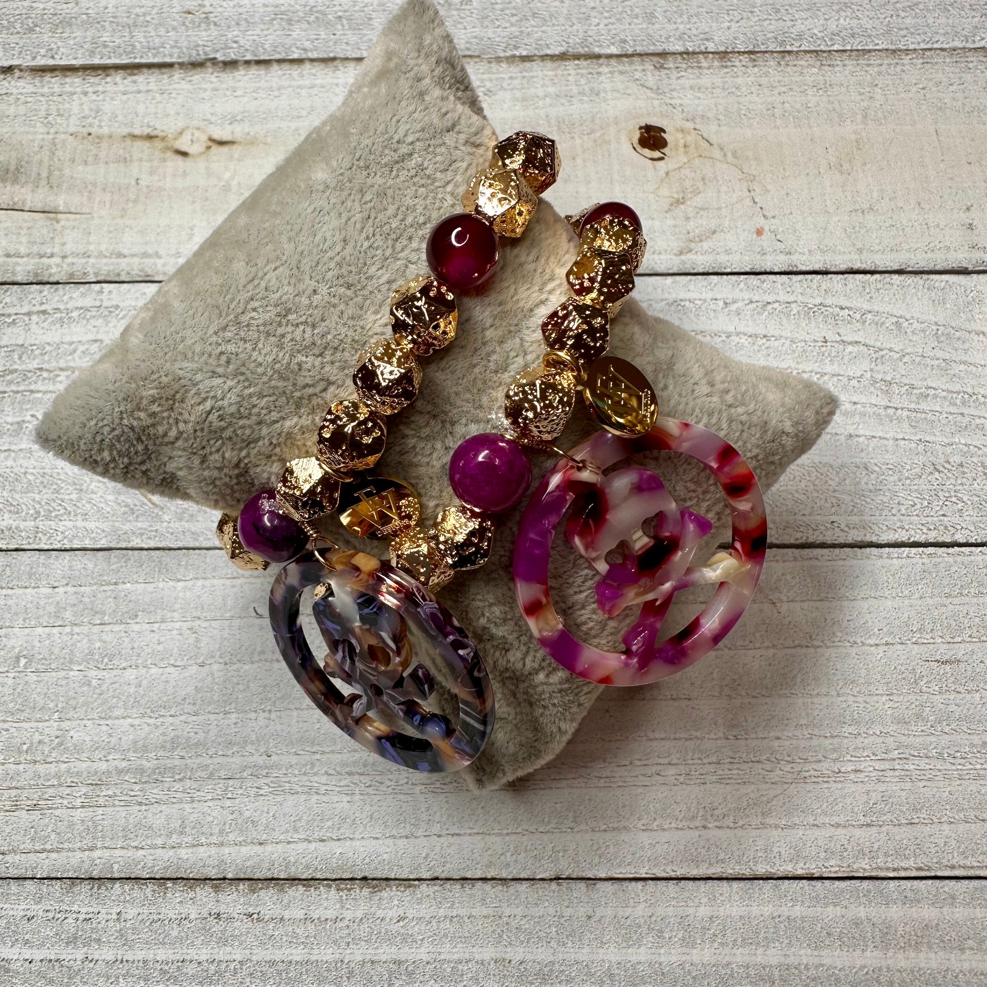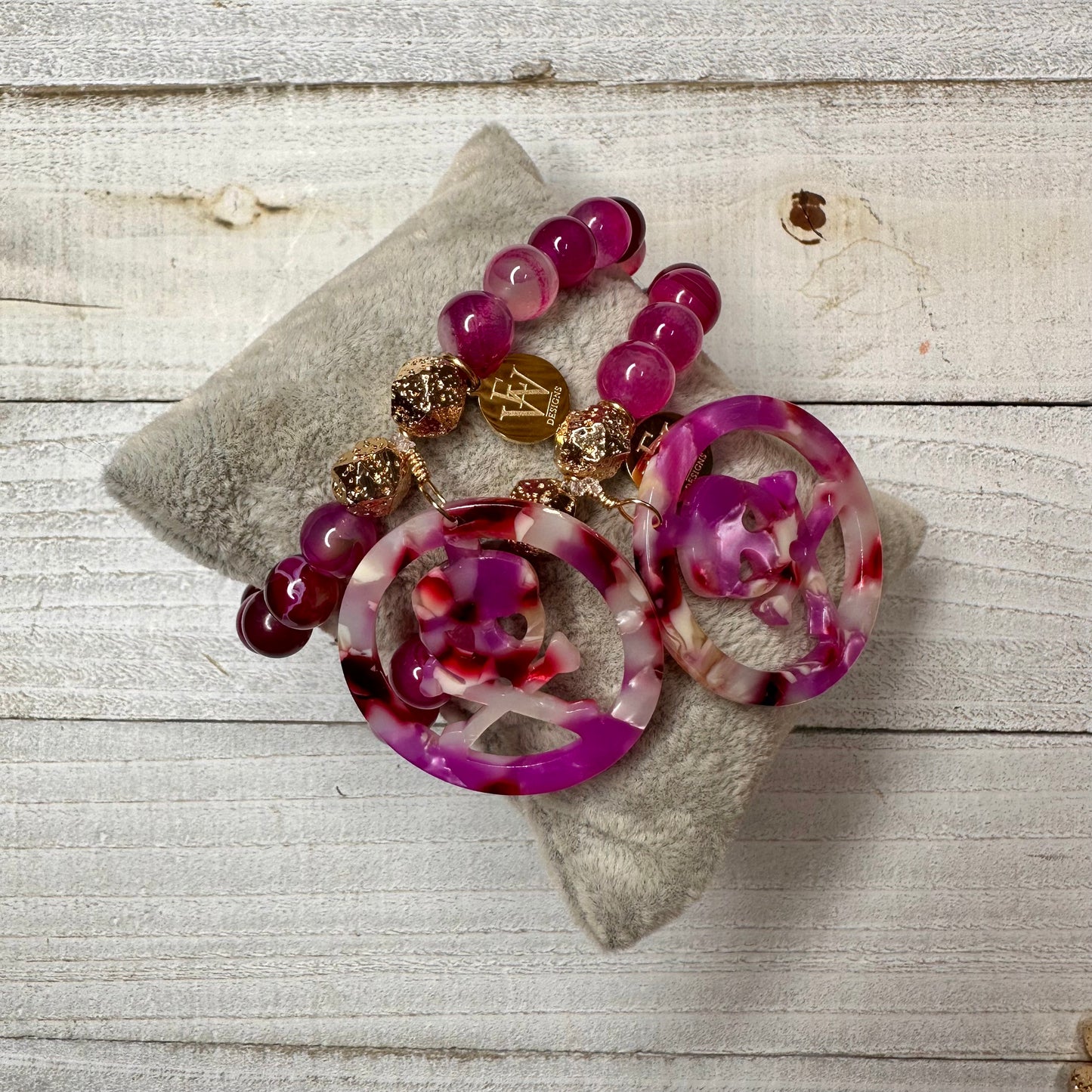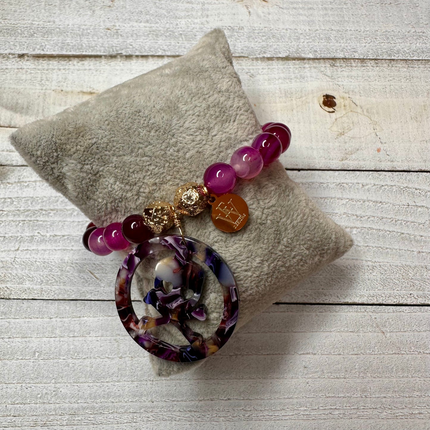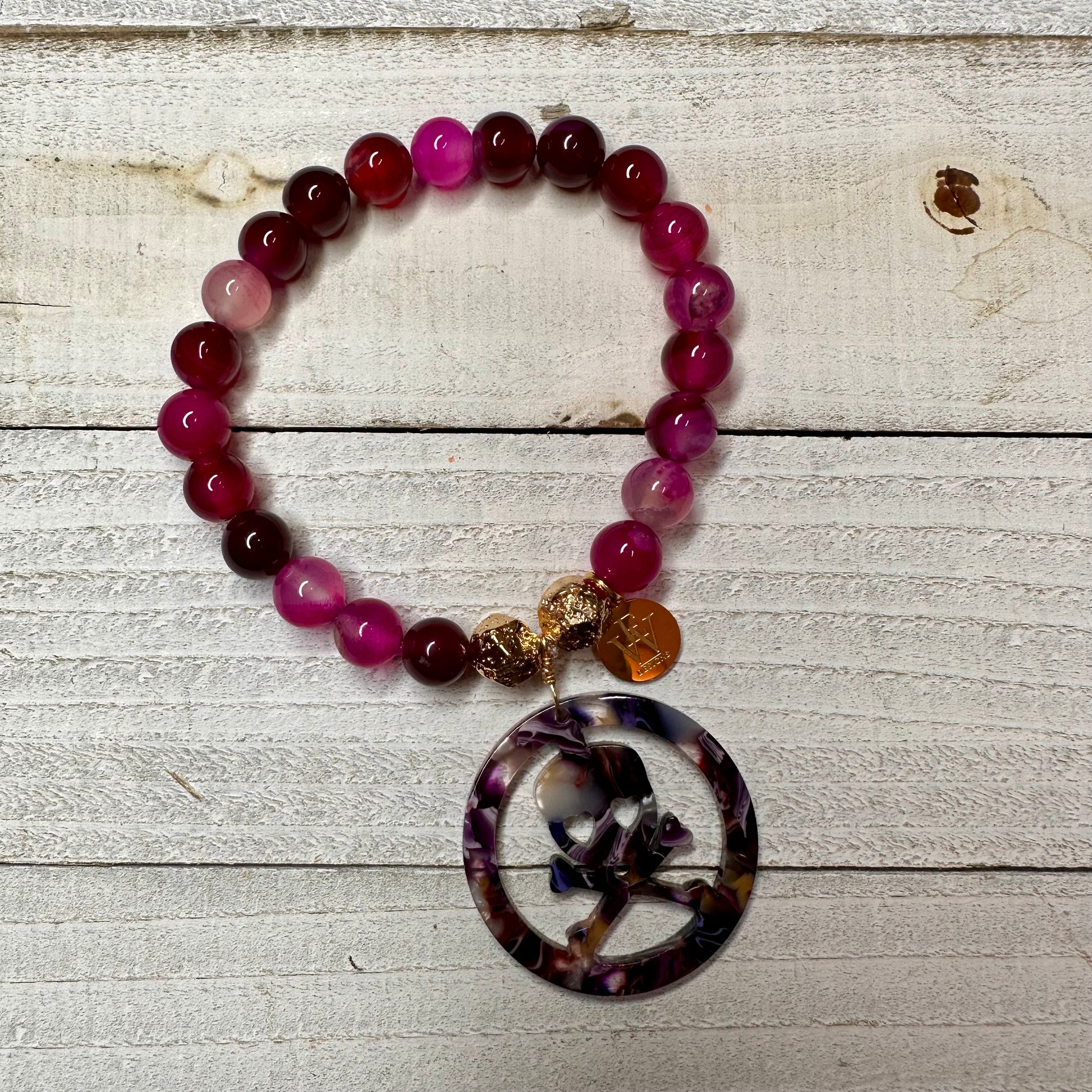 This Erika Williner Designs bracelet is made out of 6mm hot pink agate beads, 8mm gold plated hematite beads and an acetate crossed bones and skull charm.