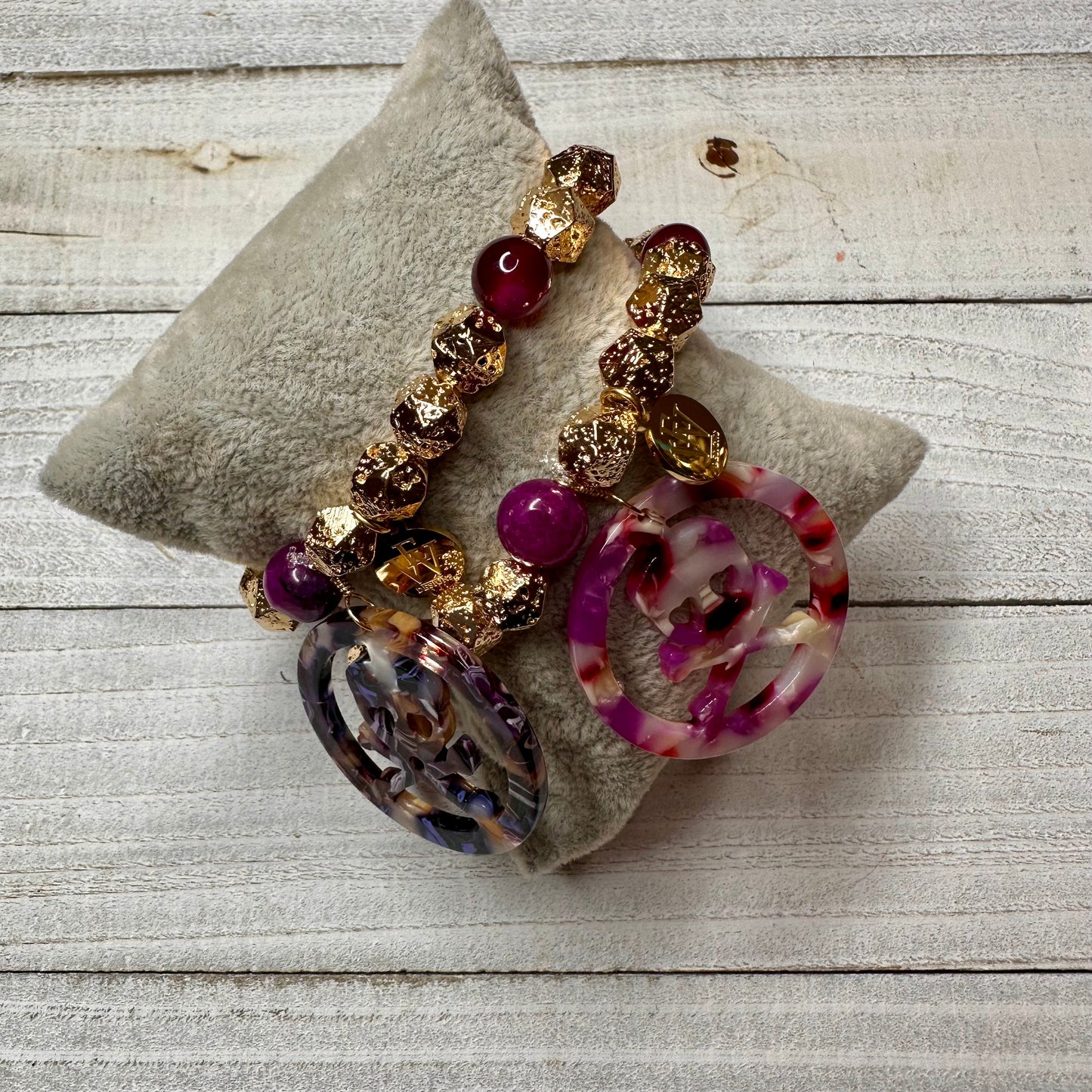 Get ready to rock and roll with this unique charm bracelet from Erika Williner Designs! The gold plated hematite beads and hot pink agate beads add a touch of glam, while the acetate crossed bones and skull charm add a playful edge. Perfect for any rocker-chic look!