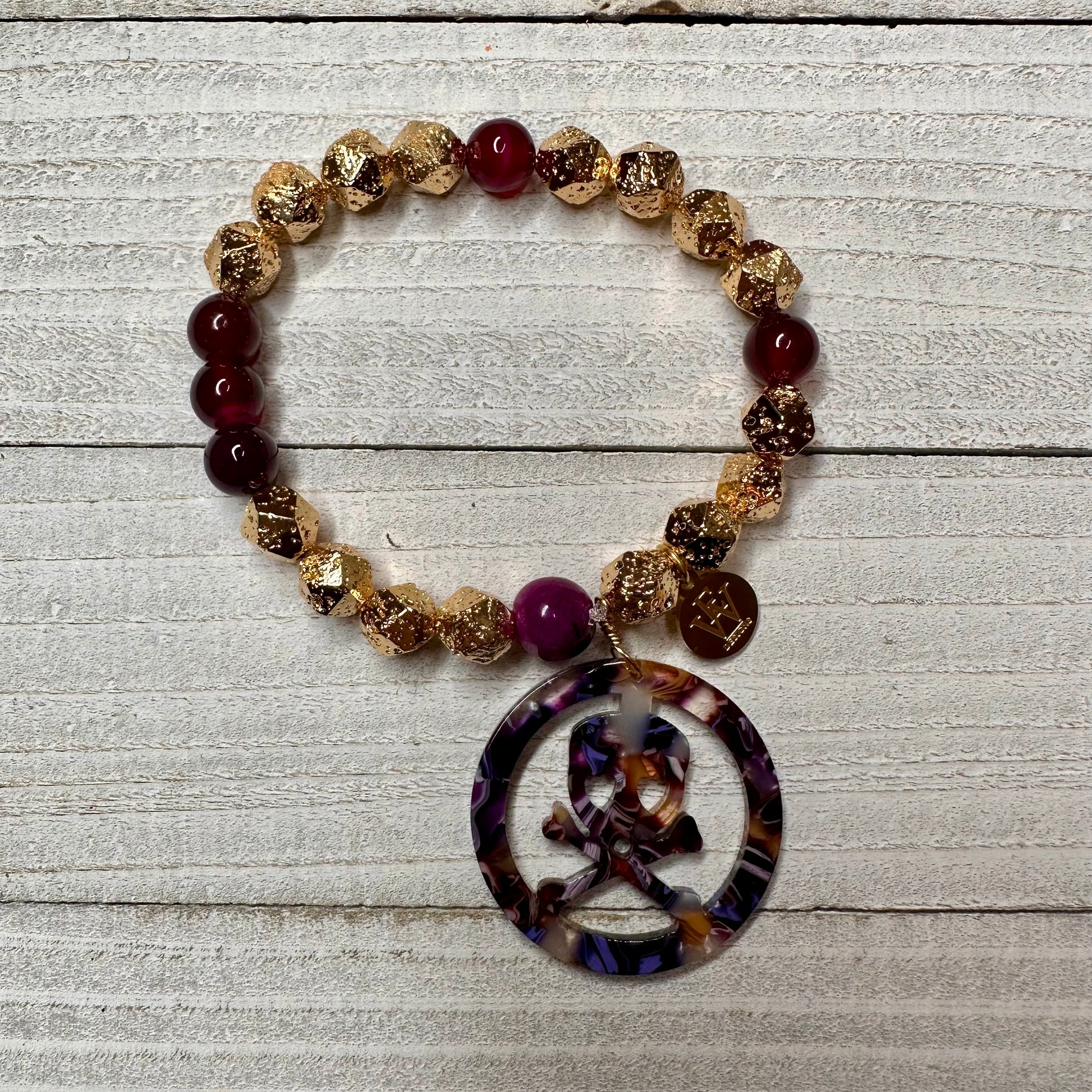 Gold Plated Hematite Beads, Hot Pink Agate Beads, Acetate Crossed Bones and Skull Charm Bracelet 410-03 | Erika Williner Designs