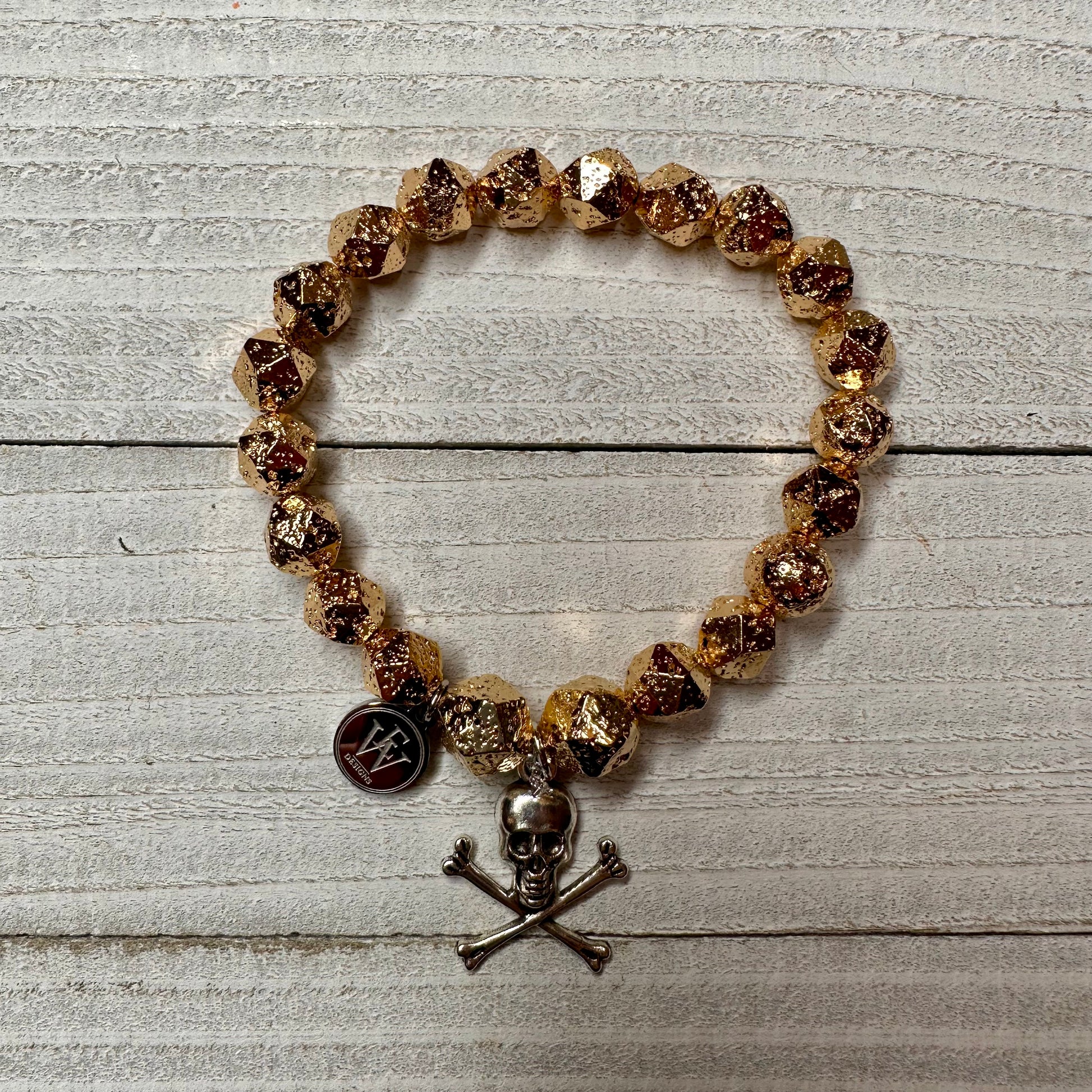 Faceted Gold Plated Lava Rock Beads Bracelet with a Metal Crossed Bones and Skull Charm 410-09 | Erika Williner Designs