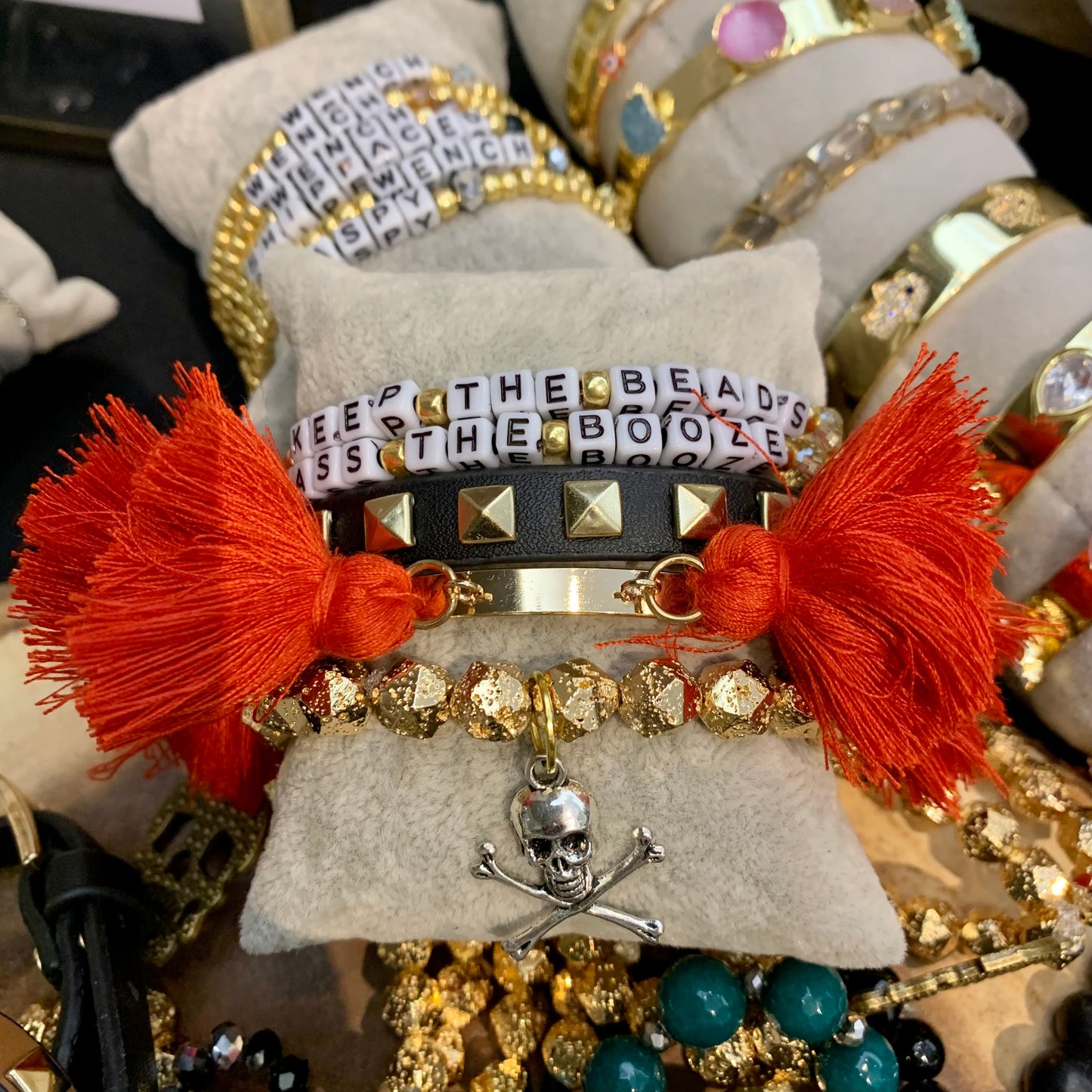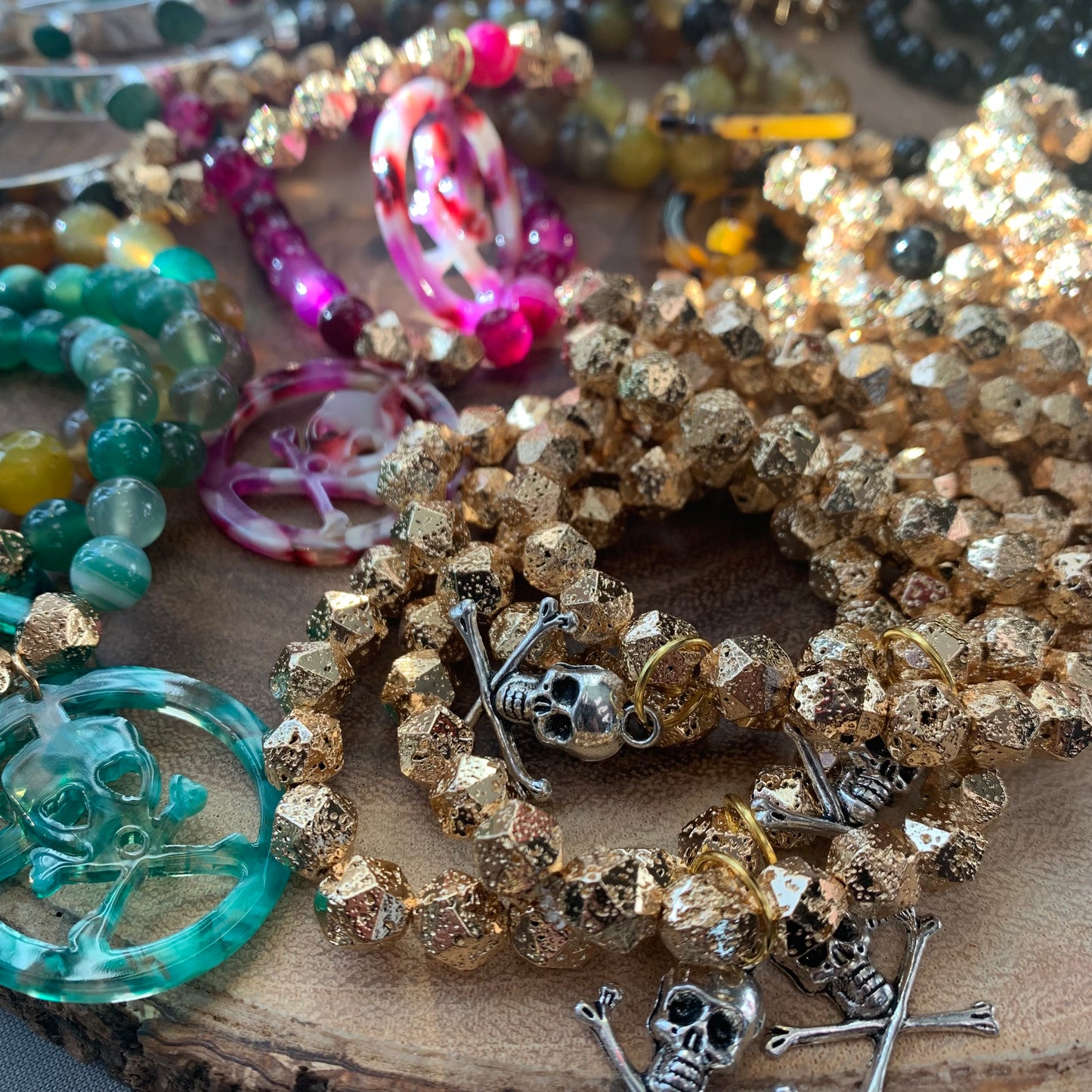 Add some edge to your style with our Faceted Gold Plated Lava Rock Beads Bracelet. Made from 8mm beads, this bracelet features a metal crossed bones and skull charm for a bold touch. Perfect for those with a unique sense of fashion or rock it during Gasparilla festivities.